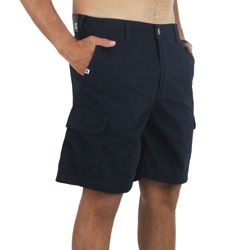 A Bermuda Cargo DC Shoes Worker Dark Blue é produzida em sarja 63% Algodão e 37% Poliéster. Corte cargo com bolsos laterias. Logo DC Shoes em etiquetas personalizadas. Cós com fechamento em botão.