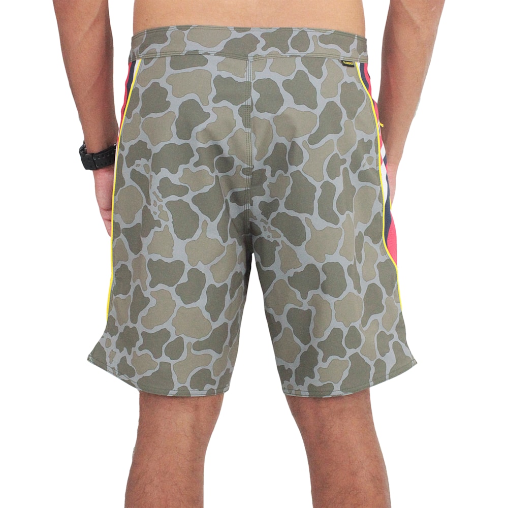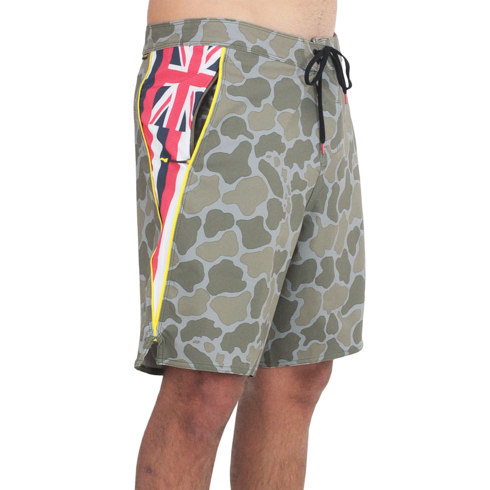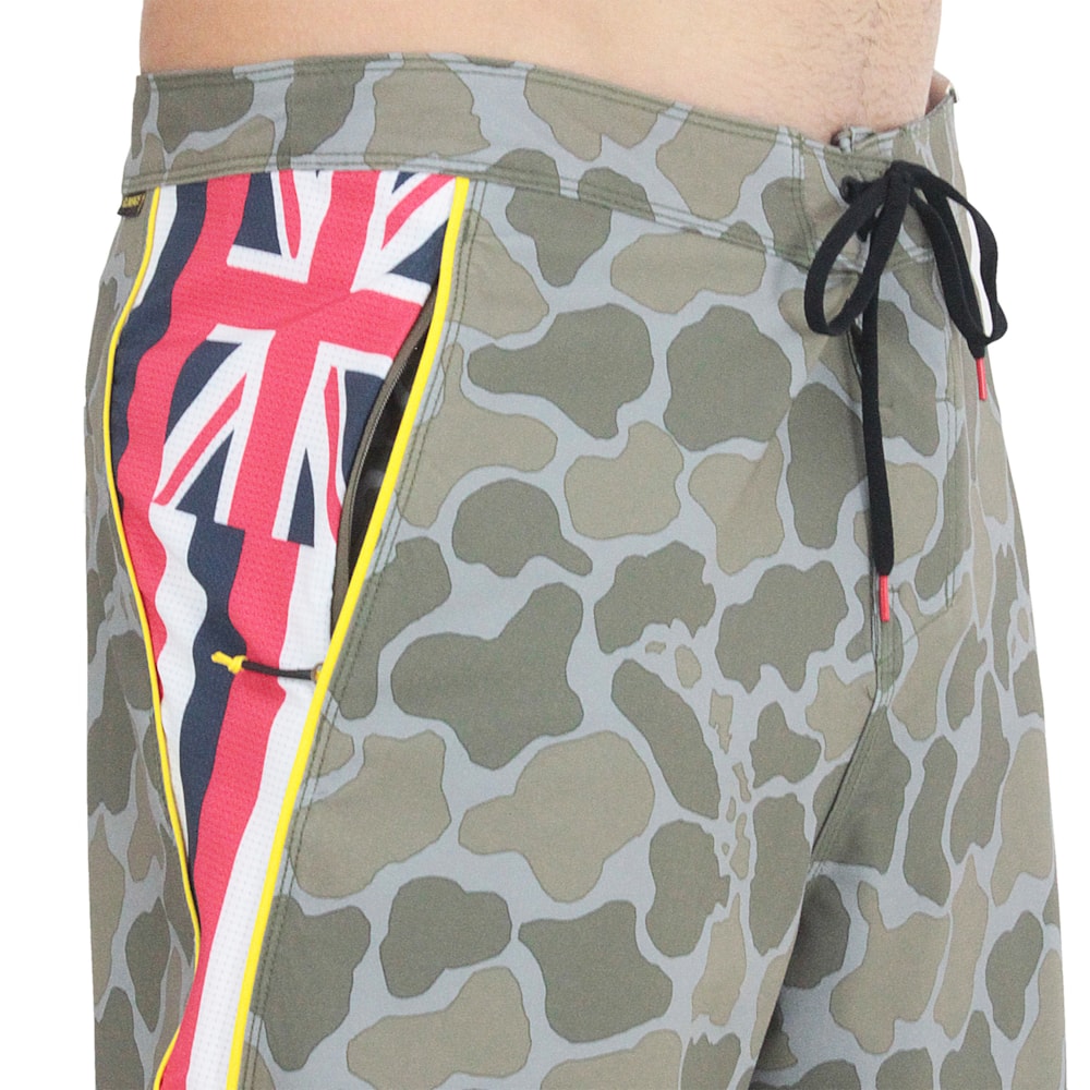 A Bermuda Florence Marine X Hawaii Airtex Oliva Camo foi produzida em tecido 4Way Stretch 80% Poliéster reciclado e 20% Elastano. Cós com fechamento Ez Fly que garante melhor ajuste. Tecido C0 DWR repele a água sem expelir fluorocarbonetos nocivos, bolso lateral com zíper para fácil armazenamento, com alça interna para chave.
