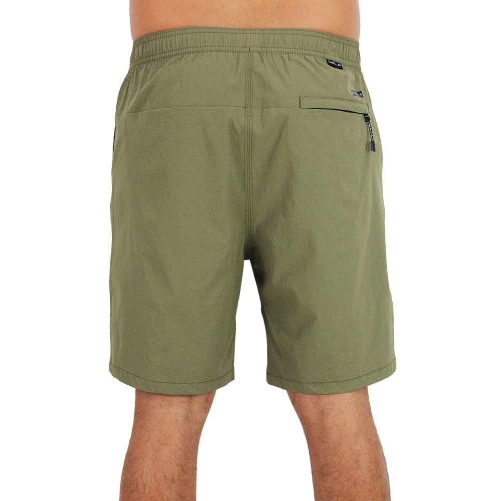 A Bermuda Rusty Essential Olive é produzida com técido 4Way Stretch leve e de secagem rápida. Logo Hang Rusty apresentado em patch termocolado na perna, cós elástico com cordão interno para um ajuste perfeito, bolsos frontais com corte faca e bolso traseiro com fechamento em ziper. Tecido 90% Poliamida e 10% Elastano, comprimento médio de 18 polegadas.