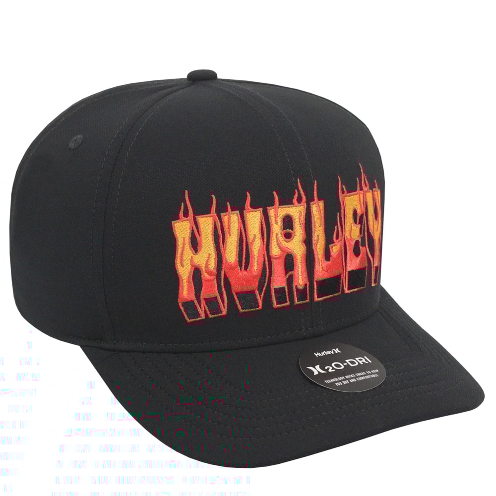 O Boné Hurley Flame Preto é produzido com tecido 100% Poliéster, que absorve o suor para mantê-lo seco e confortável durante todo o dia Aba com curva estruturada e forração com faixa de expansão H2O-DRI. Logo Hurley Flame bordado.