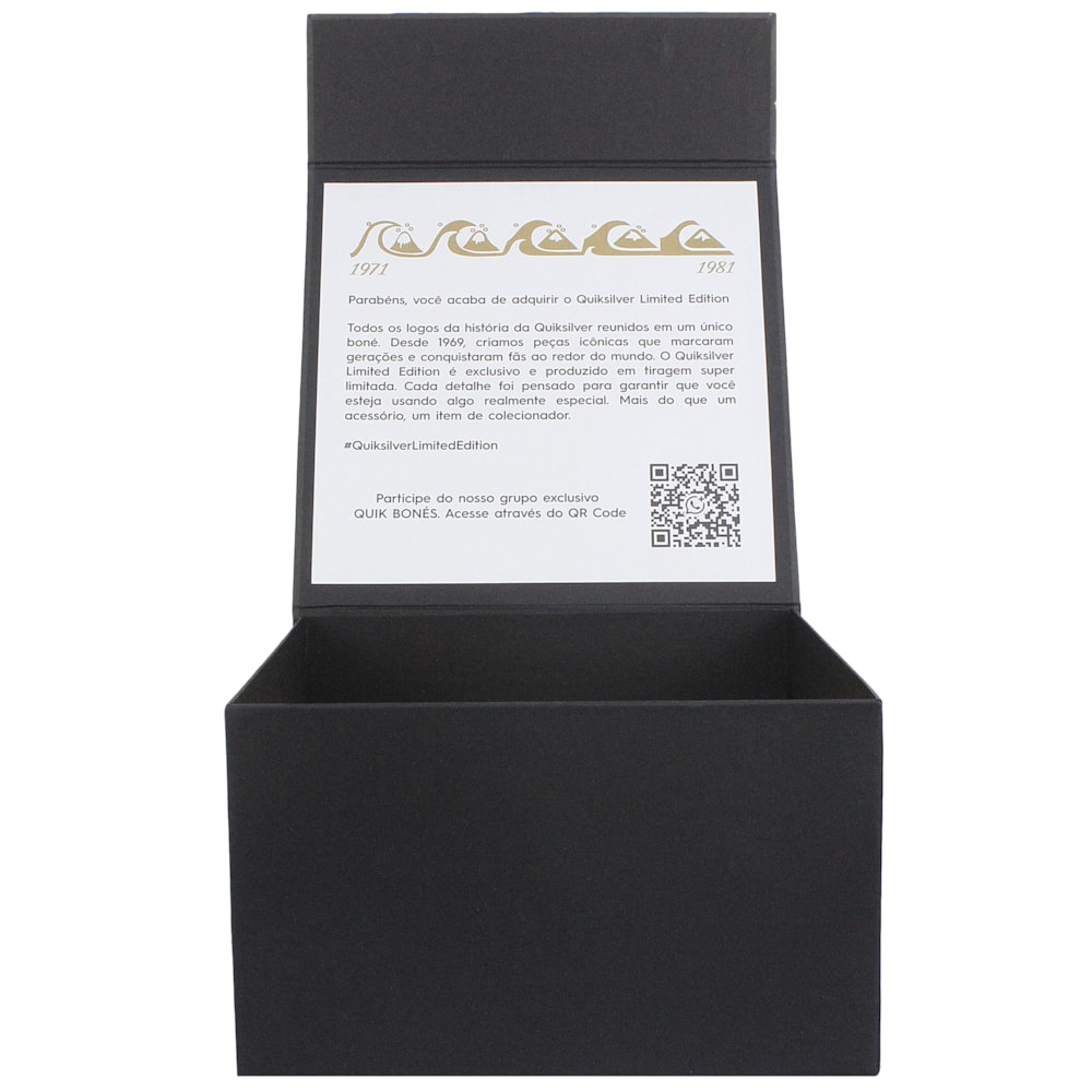 Os 301 sortudos que garantirem o boné Quiksilver Limited Edition receberão este item especial em um packaging igualmente exclusivo, com caixa especial que conta um pouco sobre a trajetória da marca e chaveiro, disponível apenas para quem adquirir o boné.