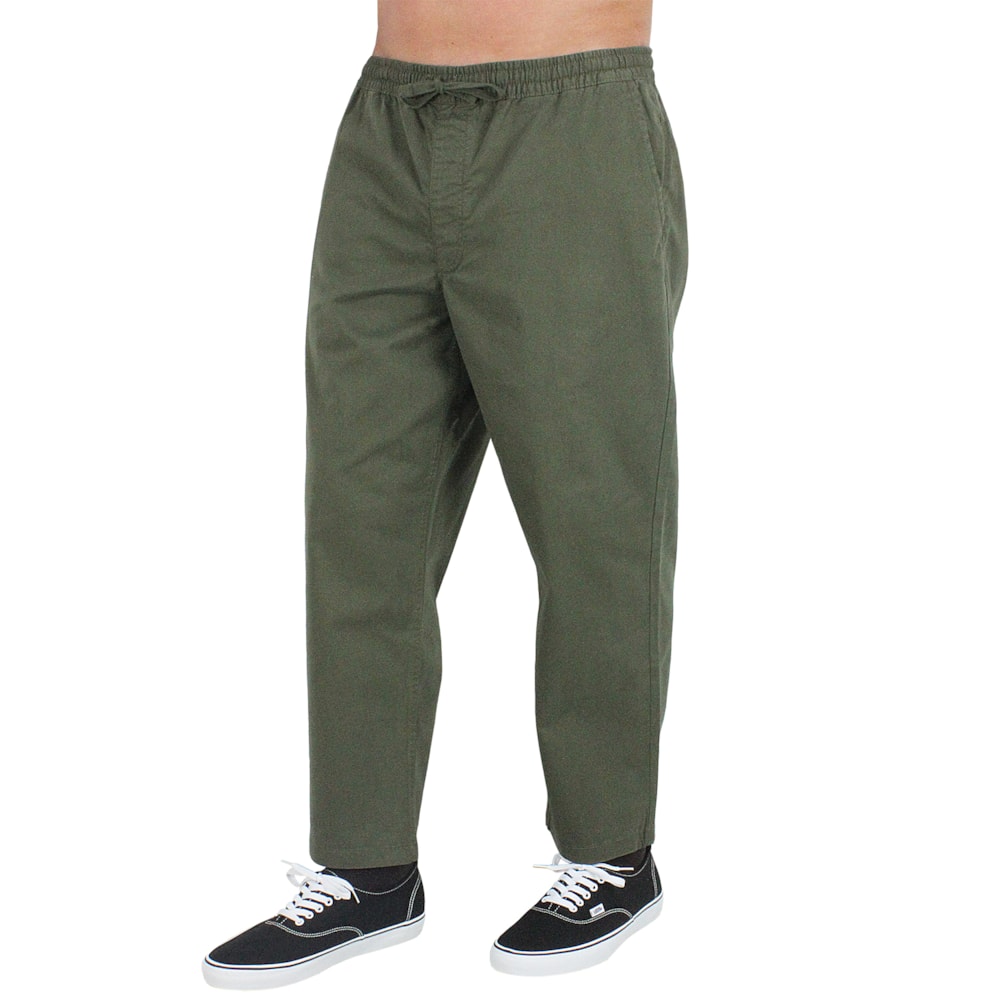 A Calça Vans Range Loose Cropped Elastic Waist Pant Grape Leaf é produzida em sarja 98% Algodão e 2% Elastano. Cós em elástico com ajuste em cordão, bolsos frontais com corte faca e bolsos traseiros embutidos. Modelagem mais curta.