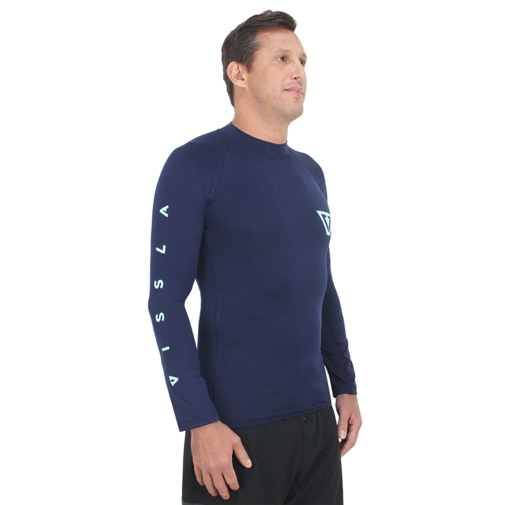 A Camiseta para Surf Vissla All Times Navyé produzida com tecido leve e confotável em uma combinação de poliéster com elastano, conta com proteção UV 50+, tratamento Anti Microbiano e secagem rápida. Estampa com o logo Vissla em silkno peito, costas e manga. Modelagem competition.