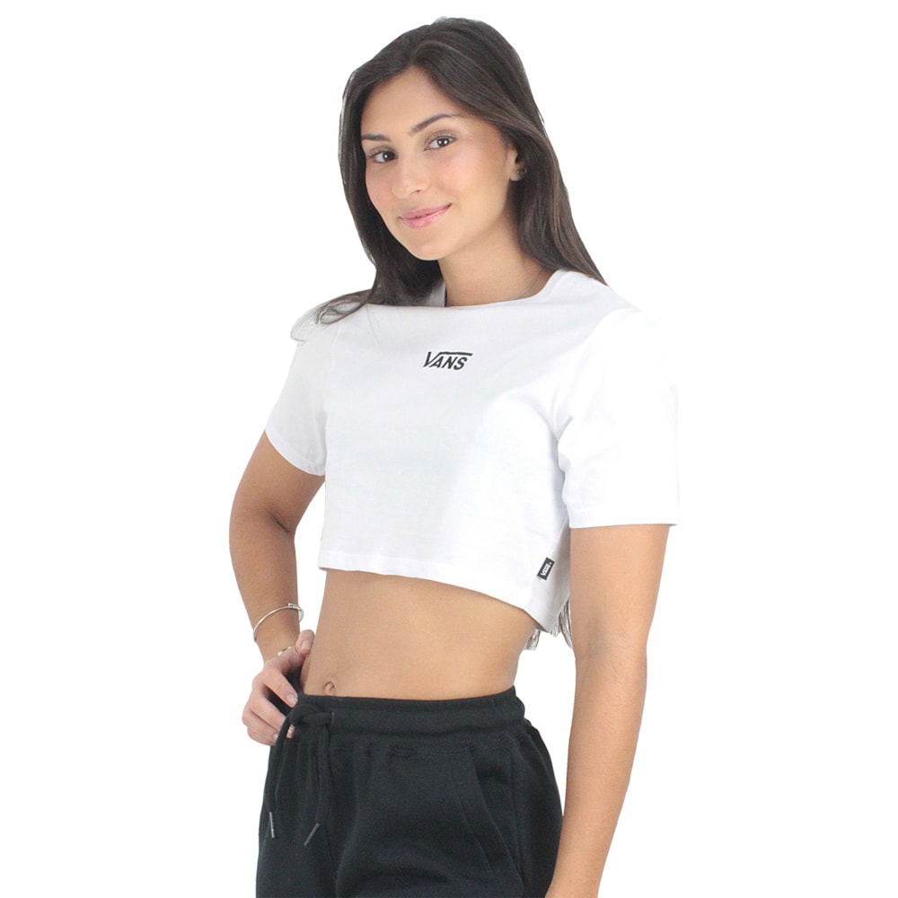 A Camiseta Vans Flying V Crew Crop II White é produzida em tecido 1/2 malha 100% algodão com modelagem Cropped, Logo Vans Classic bordado no peito. Etiqueta Vans personalizada aplicada na costura lateral.