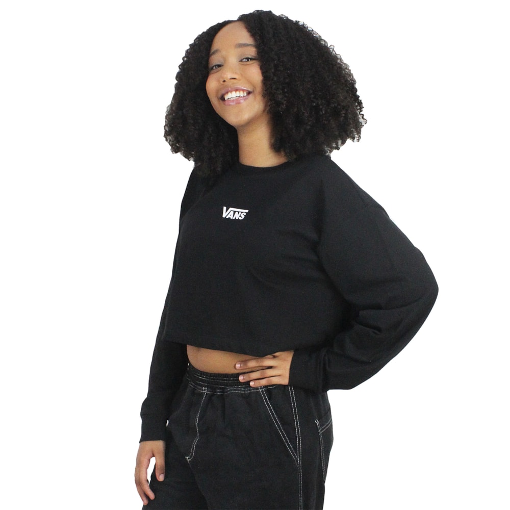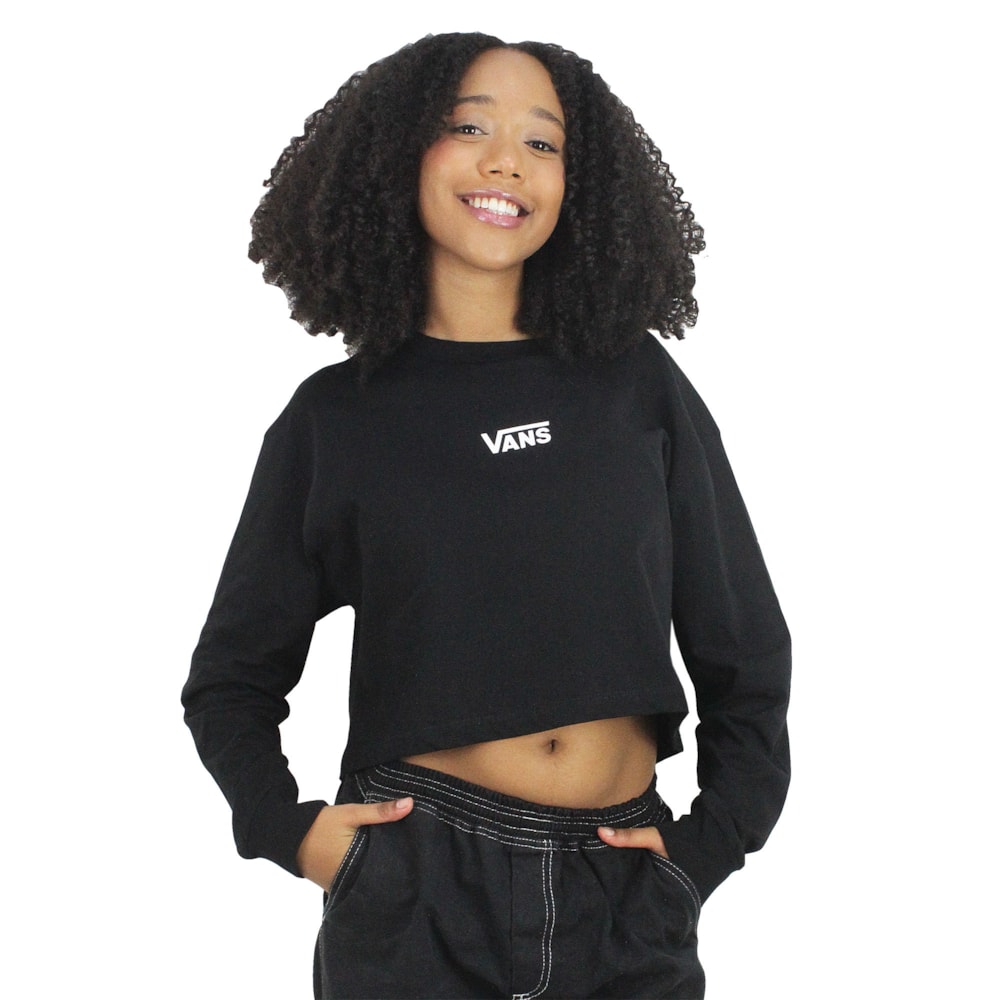 A Camiseta Vans Flying V Crop Manga Longa Black é produzida em tecido 1/2 malha 100% algodão com modelagem Cropped manga longa, estampa exclusiva Vans Classic em silk no peito. Etiqueta Vans personalizada aplicada na costura lateral.