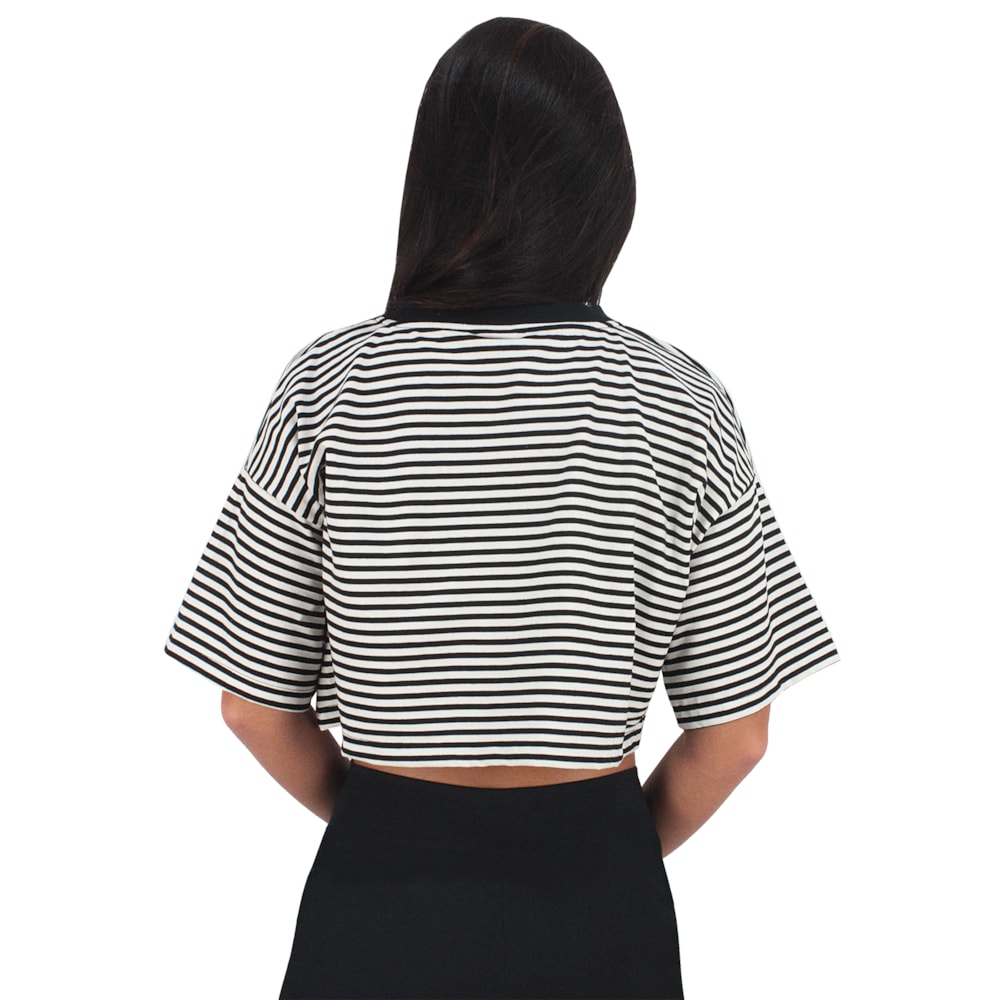 O Camiseta Volcom Cropped Stone Stripes Preto é produzido em tecido 1/2 malha 50% Algodão 50% Poliéster. Modelagem relaxed cropped, bordado Volcom Stone frontal e fio tinto listrado.