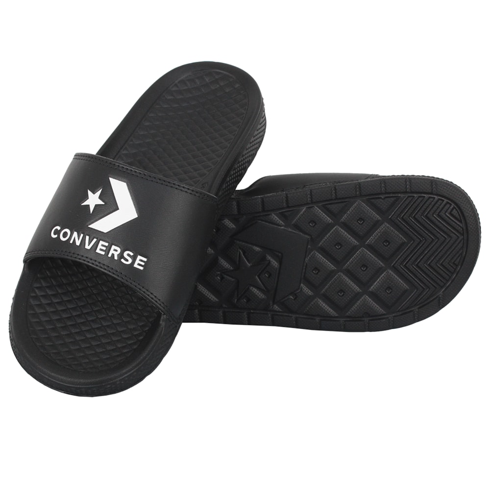 O Chinelo Converse Slide On Preto Branco Preto tem a palmilha produzida em EVA injetado, o arco anatômico oferece maior conforto e melhor calce, logo Converse Star Chevron em baixo relevo na tira