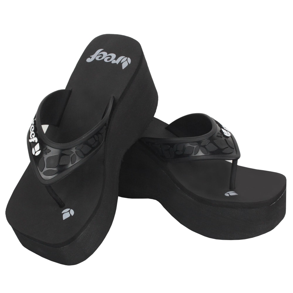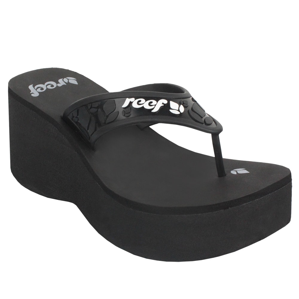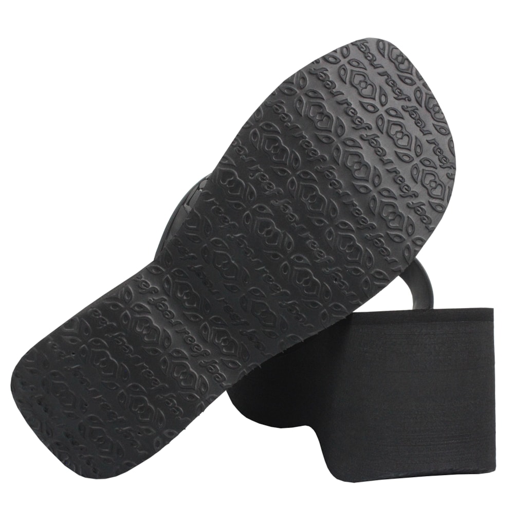 O Chinelo Reef Liv Screen Jet Black tem as tiras produzidas em poliuretano. Construido sobre uma plataforma de EVA com aproximadamente 7cm no calcanhar e 4cm no bico, logo Reef em alto relevo na tira e em silk no solado. Palmilha extramacia e solado tratorado para maior segurança e conforto.
