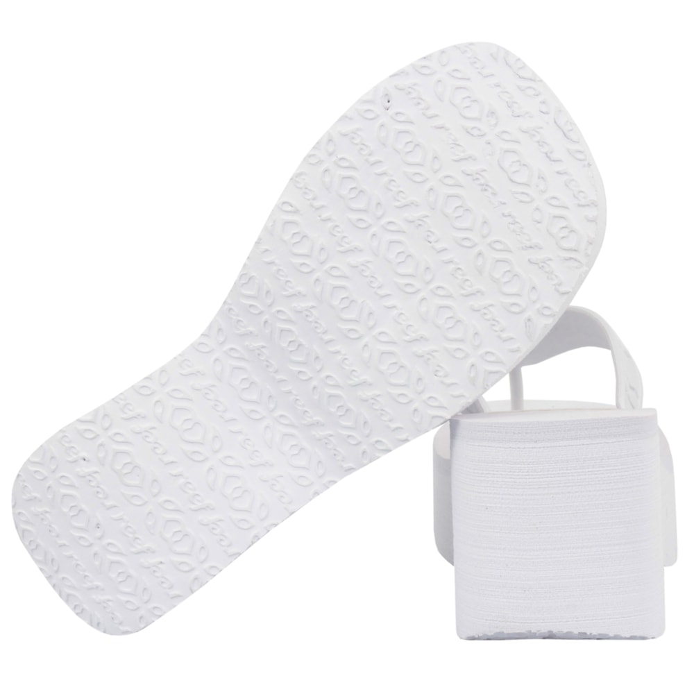 O Chinelo Reef Liv Screen Jet White Gold tem as tiras produzidas em poliuretano. Construido sobre uma plataforma de EVA com aproximadamente 7cm no calcanhar e 4cm no bico, logo Reef em alto relevo na tira e em silk no solado. Palmilha extramacia e solado tratorado para maior segurança e conforto.