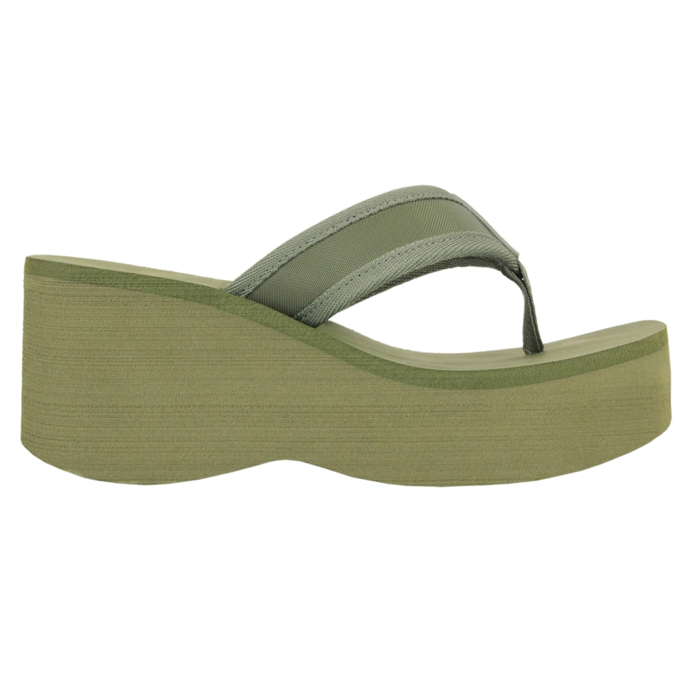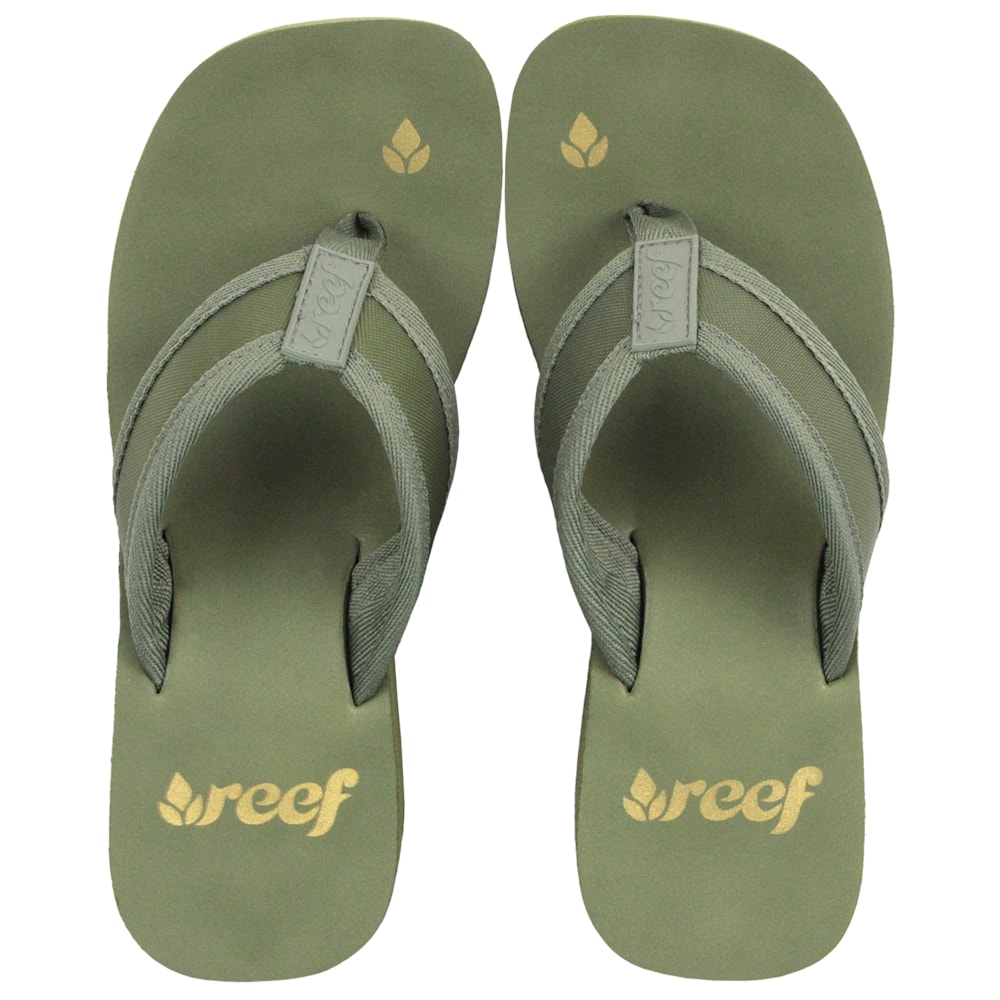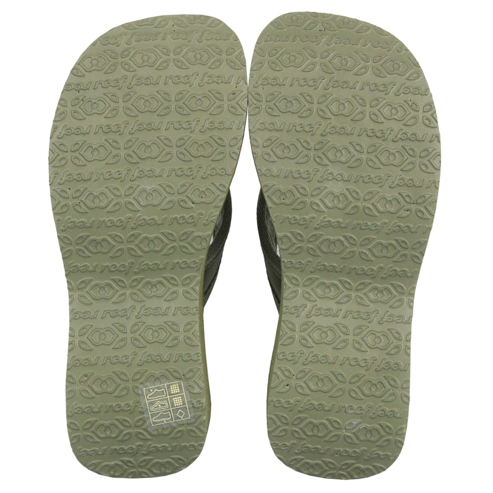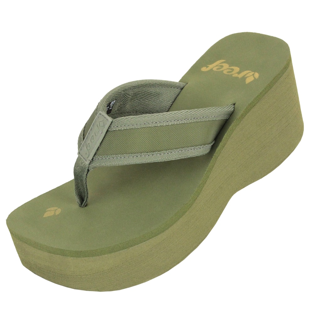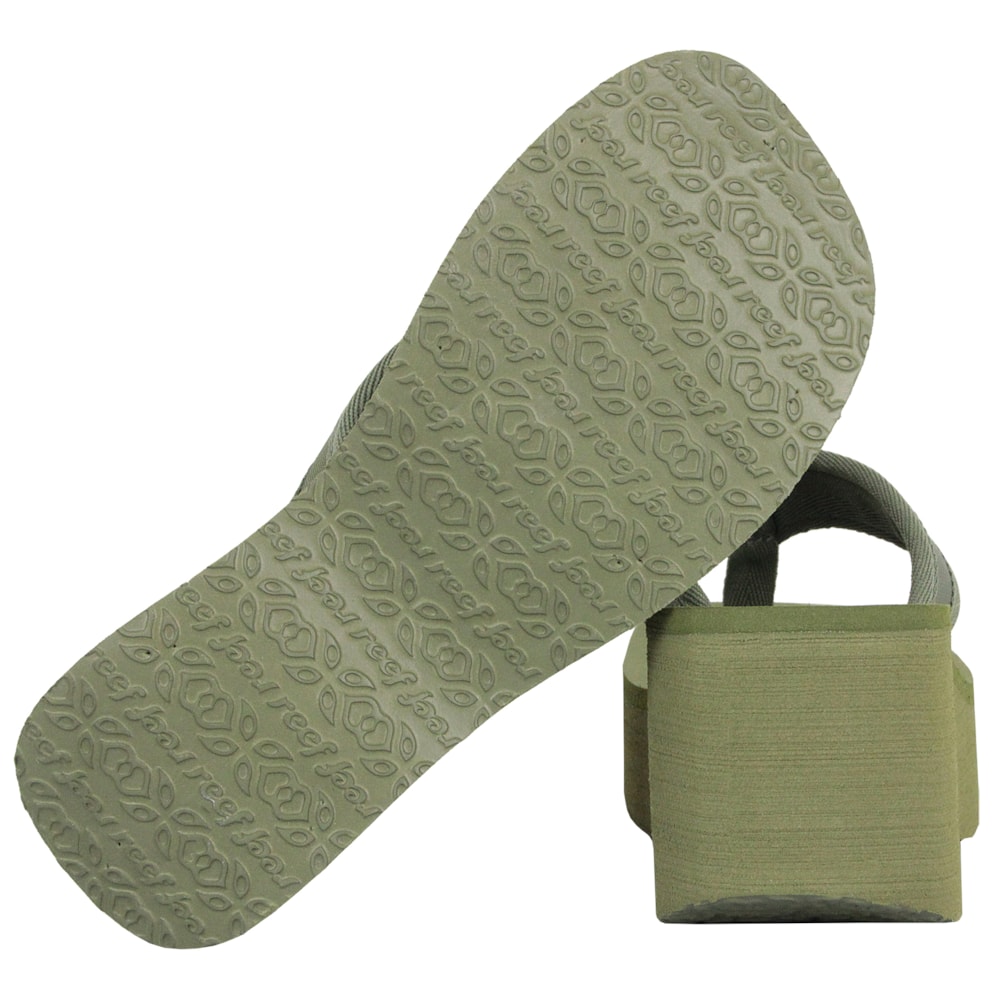 O Chinelo Reef Liv Screen Olive tem as tiras produzidas em nylon e poliéster. Construido sobre uma plataforma de EVA com aproximadamente 7cm no calcanhar e 4cm no bico, logo Reef em etiqueta emborrachada na tira e em silk no solado. Palmilha extramacia e solado tratorado para maior segurança e conforto.