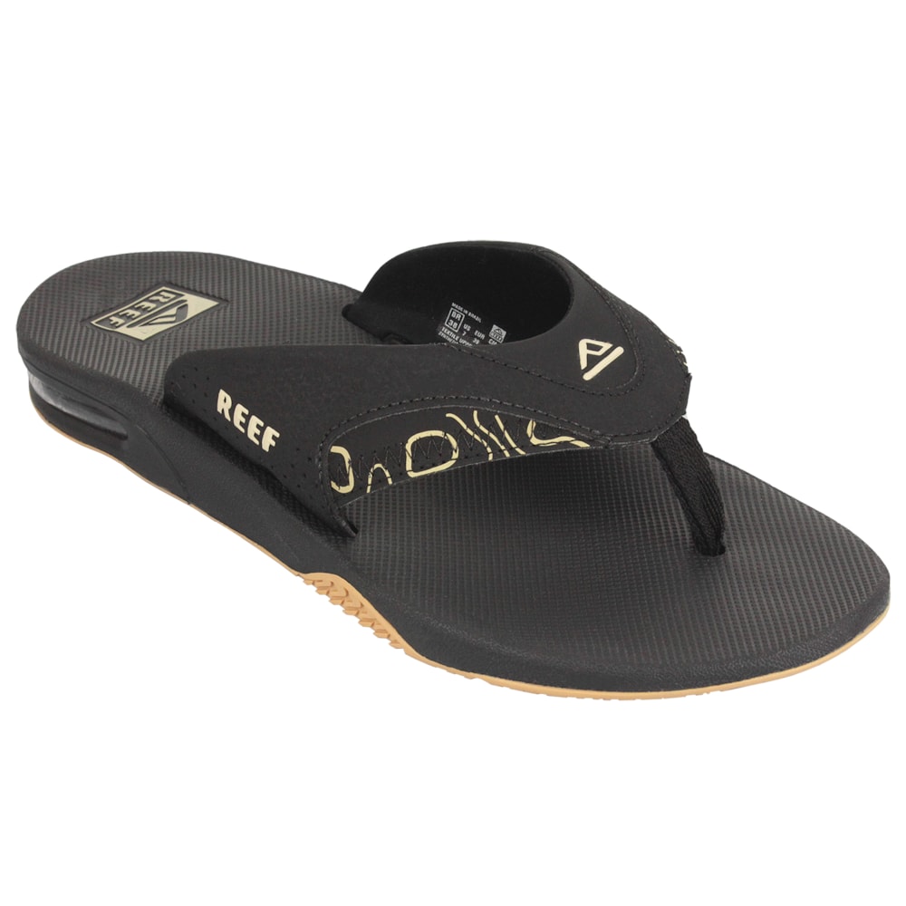 Abridor de garrafa embutido na sola, invenção patenteada pela Reef.