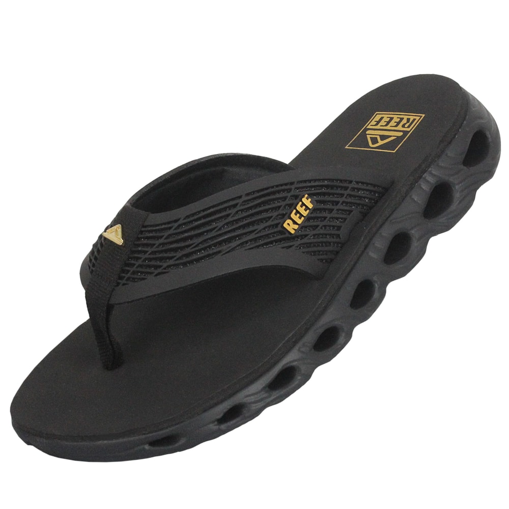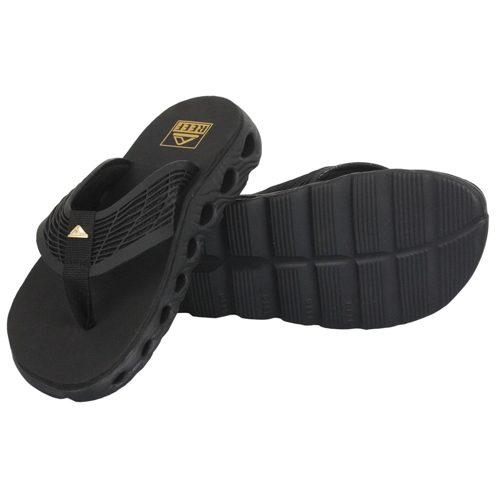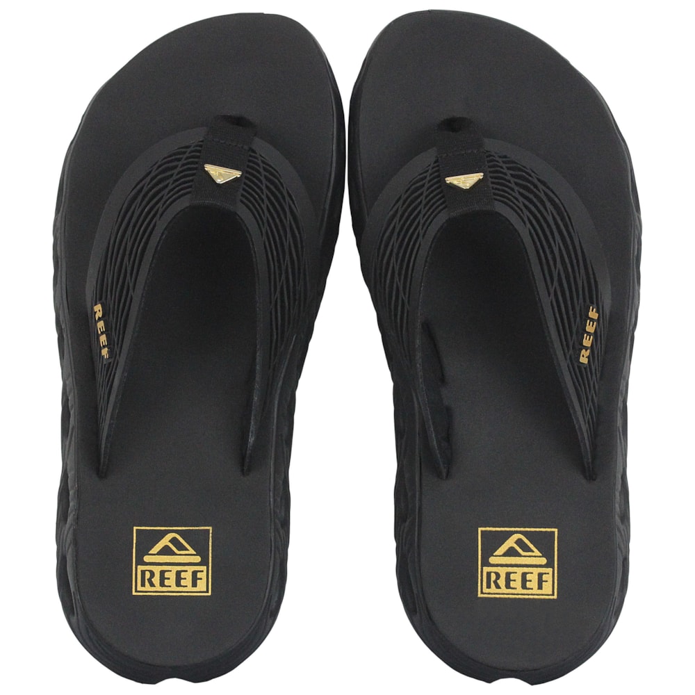 O Chinelo Reef Vision Black Gold tem as tiras largas, produzidas em TPU com forração interna que garante conforto e reistência, palmilha produzida em EVA soft touch com 7mm de espessura. Logo Reef apresentado em Pin metálico na tira , solado vazado em EVA injetado que garante leveza e ótima tração.