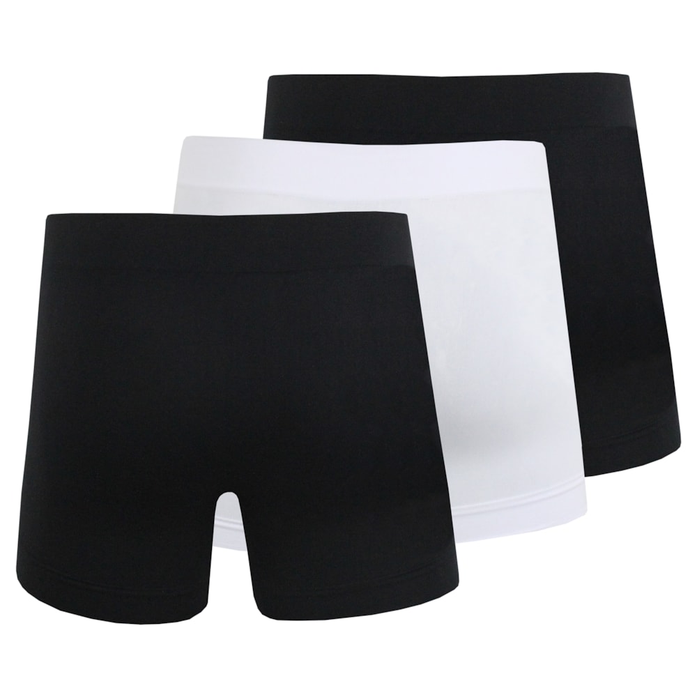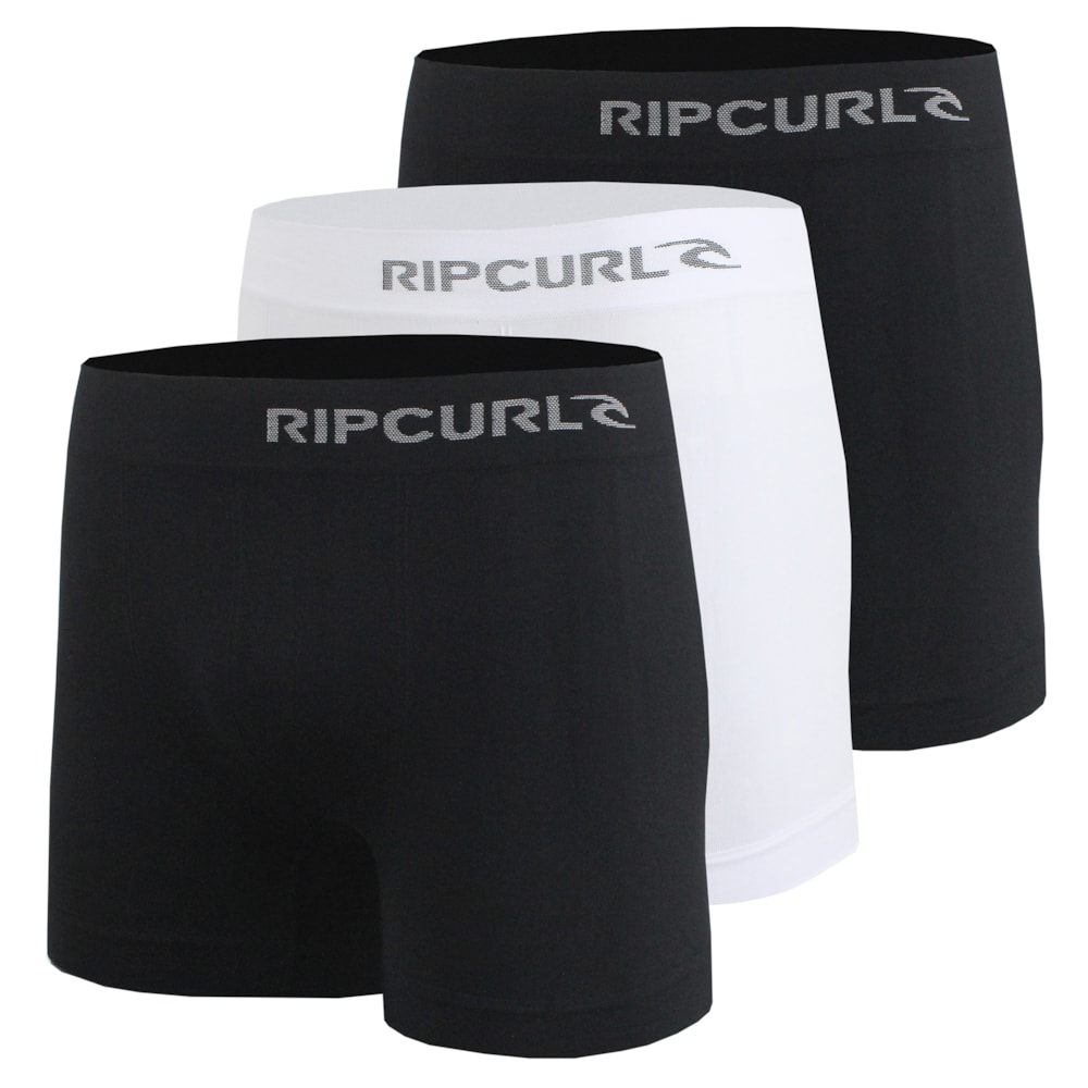 A Cueca Boxer Rip Curl Comfort Kit com 3 Black White sem costuras é produzida em tecido 95% Poliamida, 04% Elastano e 01% Poliprolpileno.