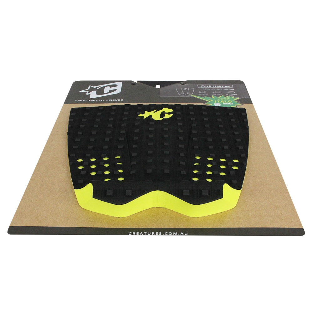 O Deck para Prancha de Surf Creatures Italo Ferreira Preto Limão foi desenvolvido em parceria com o Campeão Olímpico e Mundial Ítalo Ferreira. Produzido em 3 peças, combina o sistema de tração fresado Square Lock nas laterais com a faixa central Thermo Lite e cola 3M, que permitem máxima aderência na prancha, contribuindo para a performance do atleta. Arco central de 7mm em forma de lagrima e Kicktail de 28mm.