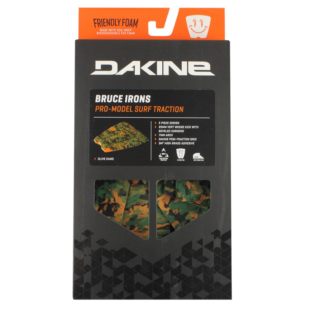 O Deck para Prancha de Surf Dakine Bruce Irons Olive Camo apresenta as medidas personalizadas do arco e kicktail usadas por um dos ícones do surf. Este Deck de cinco peças apresenta um arco central de 7mm e um kicktail de 25 mm com bordas chanfradas. Como todo Deck Dakine, é produzido de Espuma amigável biodegradável, vendida em embalagens sem plástico e usa adesivo 3M® de grau marítimo.