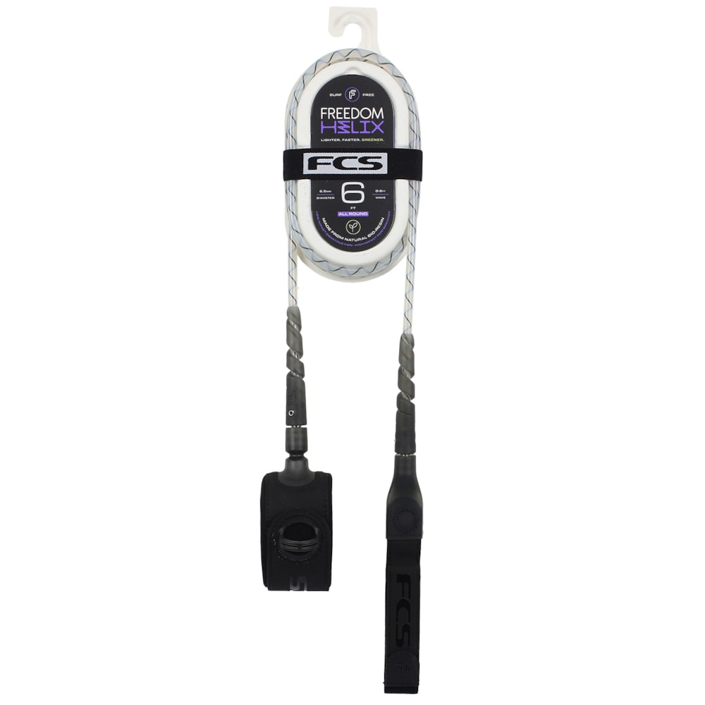 O Leash FCS Freedom Helix 6 X 6.5 All Round foi desenvolvido à partir de bio-resina à base de milho de origem natural, que resulta em um cabo mais leve e mais reistente.