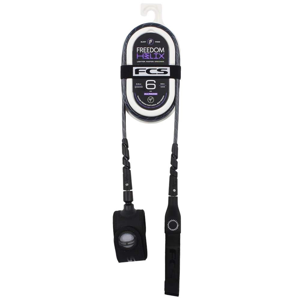 O Leash FCS Freedom Helix 6 X 6.5 All Round foi desenvolvido à partir de bio-resina à base de milho de origem natural, que resulta em um cabo mais leve e mais reistente.