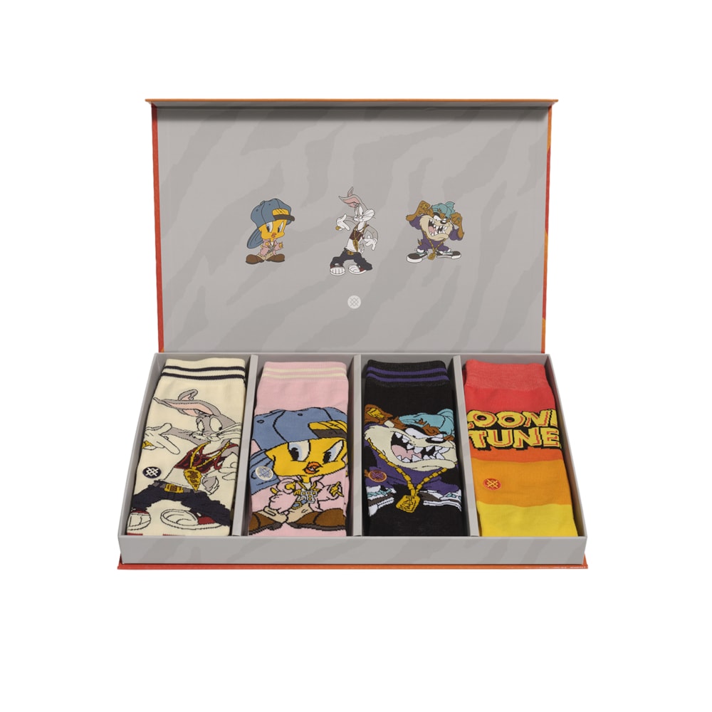 O Looney Tunes Box Set é um kit de 4 pares exclusivos, meias de cano alto, fabricadas com tecido macio e elástico que se moldam ao pé para conforto durante todo o dia.