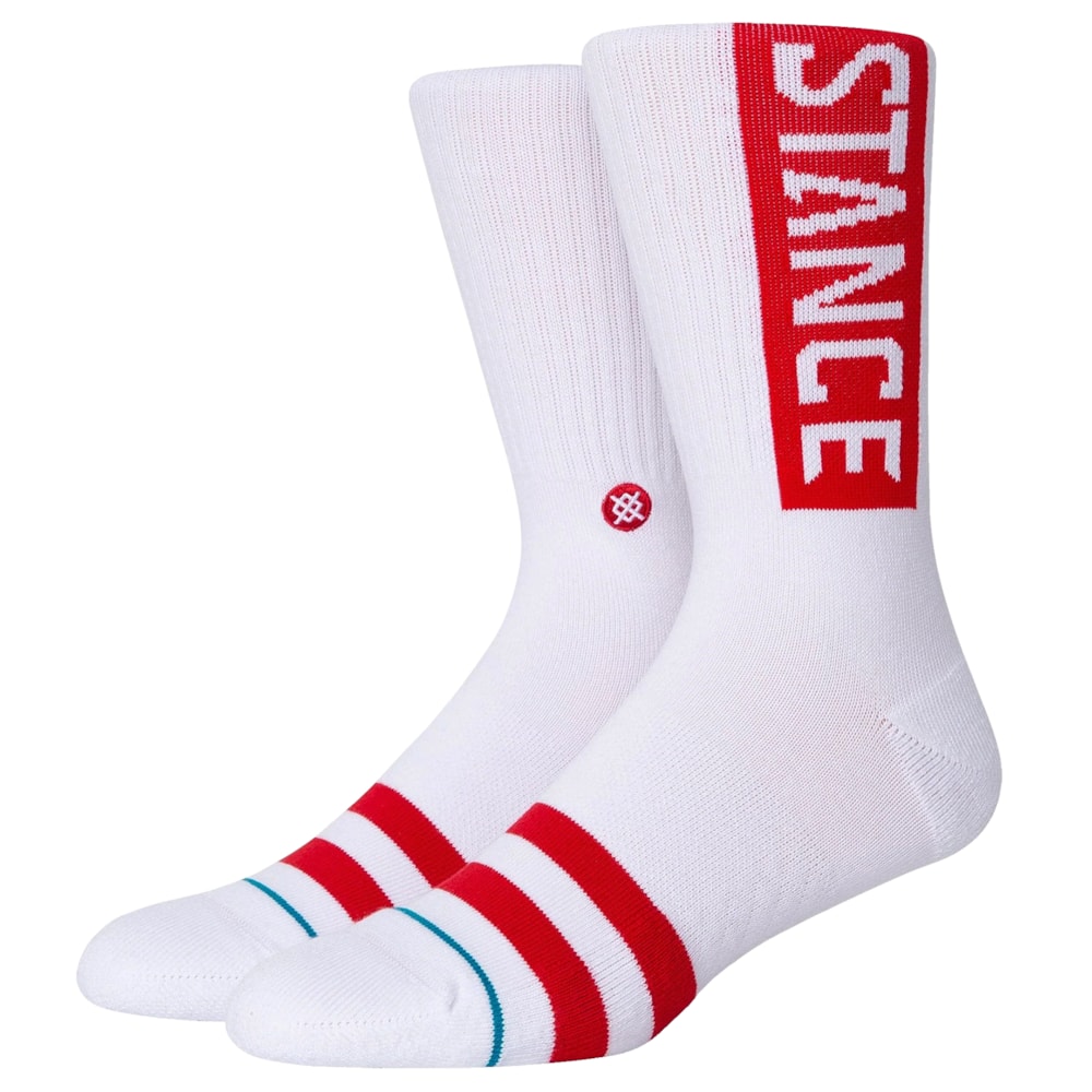 A Meia Stance OG White Red é um modelo de cano alto, fabricada com tecido macio e elástico que se molda ao pé para conforto durante todo o dia.