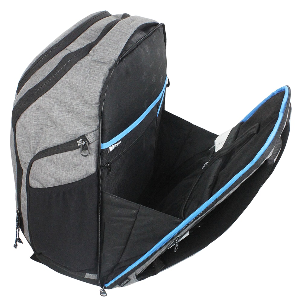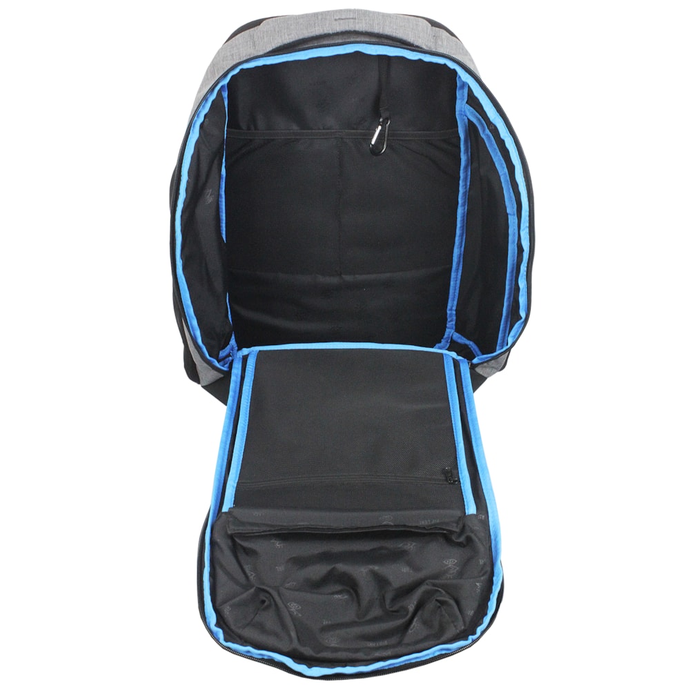 Poliéster Rip Stop 600D com tratamento Hydro protech. Bolso frontal forrado de lã ideal para guardar seu óculos de sol, painéis frontal e traseiro moldado em EVA para maior proteção, bolso isolado para garrafa. Amplo compartimento central com abertura 180º, compartimento traseiro acolchoado para laptop.
