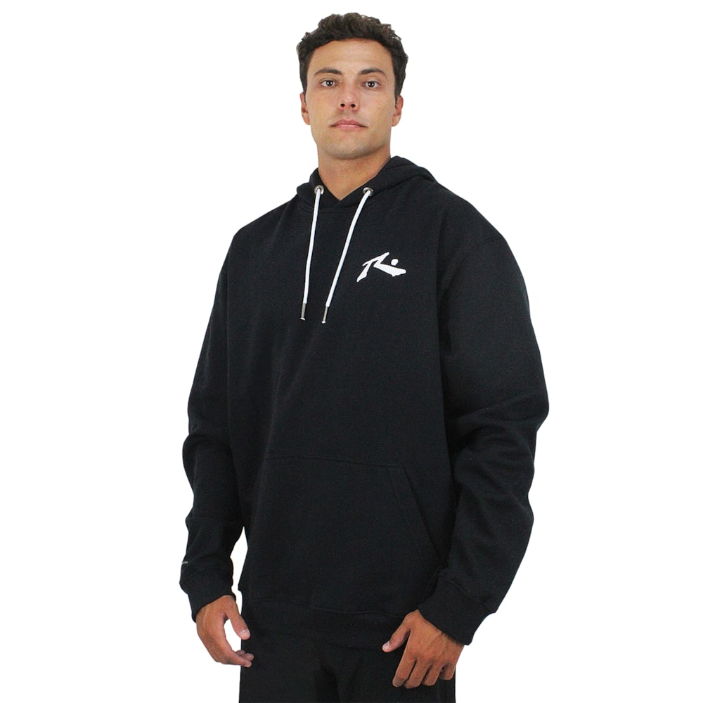 O Moletom Extra Grande Rusty Soft Hit Black é produzido com moletom flanelado 240G 75% Algodão e 25% Poliéster. Forro do capuz em tecido 1/2 Malha. Bolso canguru, punho e barra com acabamento em ribana. Estampa com o tradicional logo Rusty R Dot em silk em toque no peito.