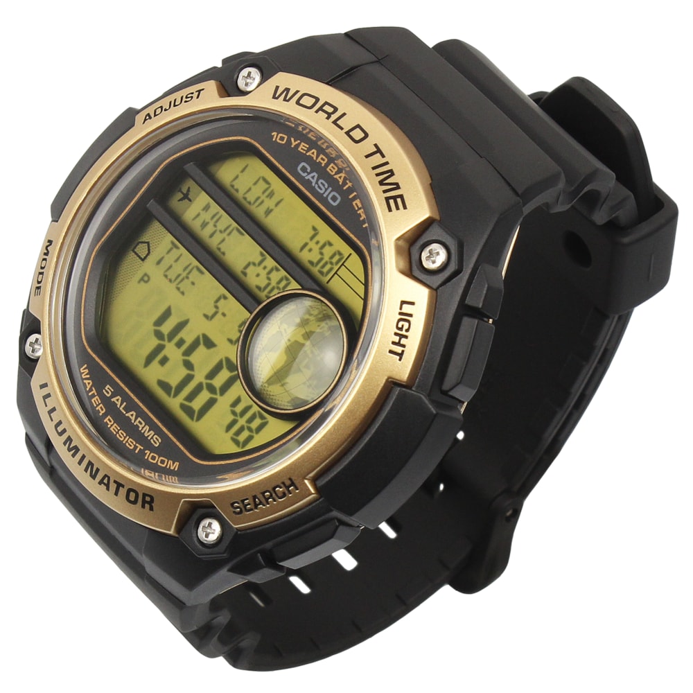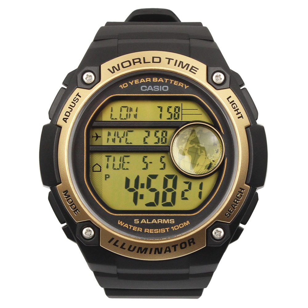 Exibição de hora de 3 cidades simultaneamente, mapa mundial com vidro curvo. Estojo de tamanho grande, resistente à água a até 100 metros. Cronômetro, bateria com até 10 anos de duração.
