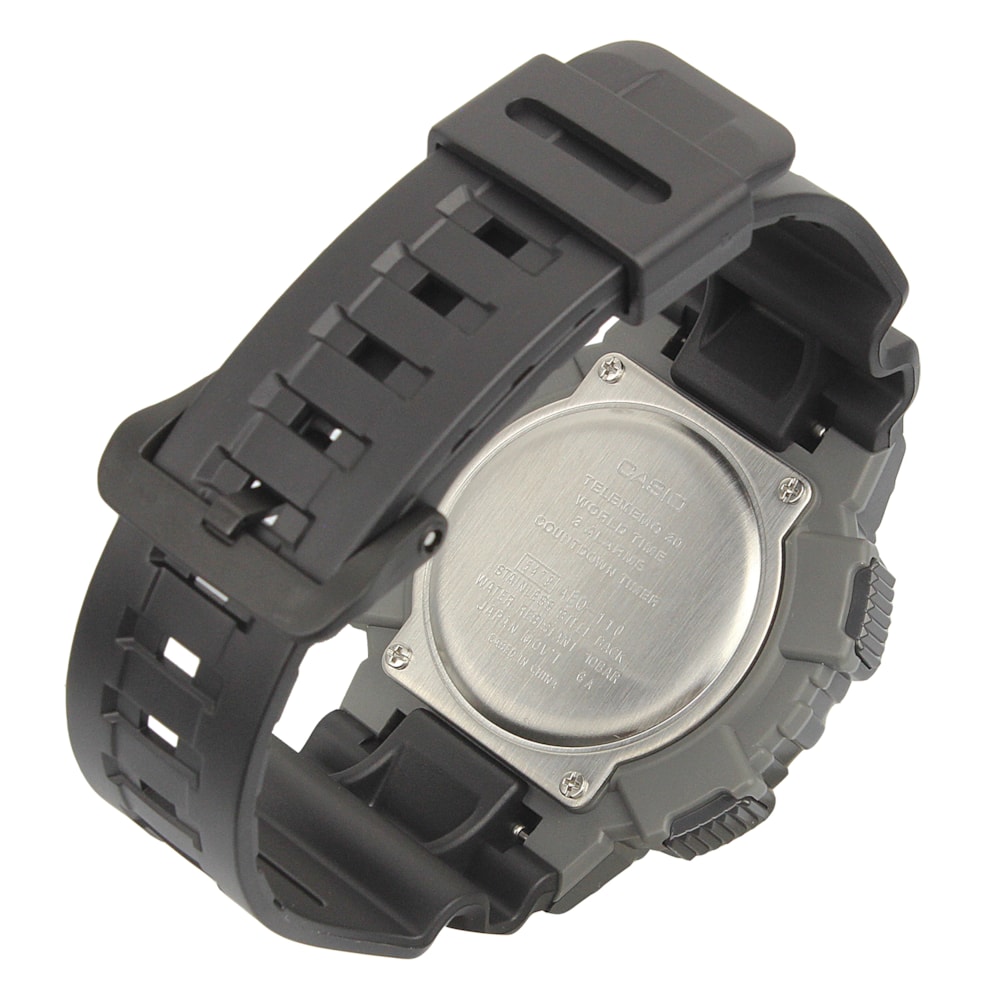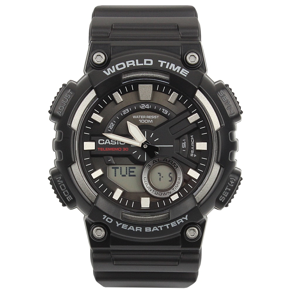 Os Relógio Casio AEQ-110W contam com bateria que duram até 10 anos e hora mundial Resistência a água a até 100 metros 10 anos de duração da bateria Hora mundial 30 registros de memória telefônica Cronômetro de 1/100 segundo Alarmes