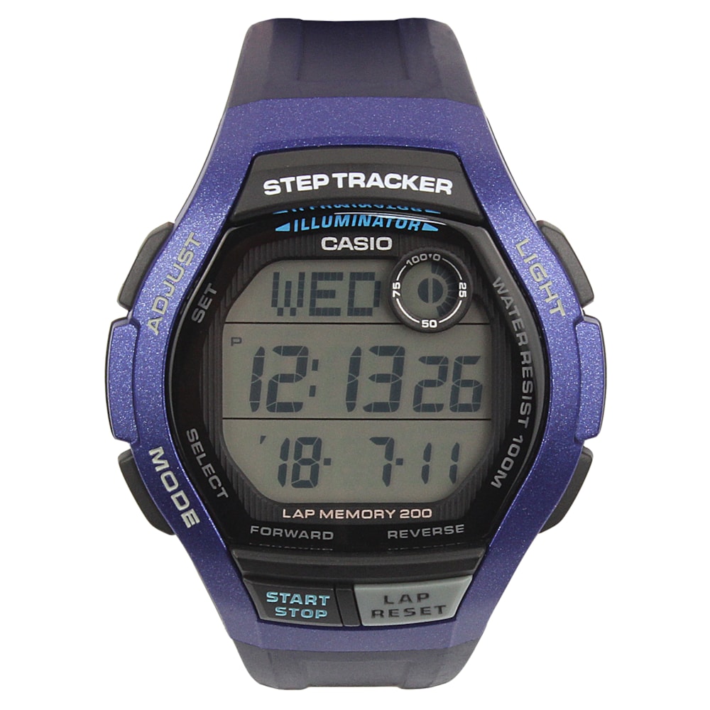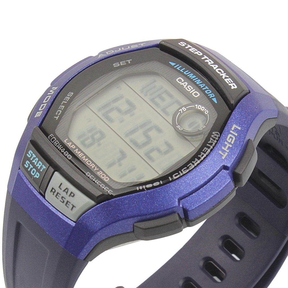 O Relógio Casio WS-2000H conta com um acelerômetro de 3 eixos que começa a contar seus passos automaticamente quando você começa a se mover enquanto o usa. Um Gráfico de contagem de passos no visor mostra os passos que você já deu, sua taxa de alcance de metas de passos e a quantidade de dias que você levou para alcançá-las. Você também pode manter um histórico da contagem de passos dos últimos sete dias. Isso e muito mais fazem desses relógios as ferramentas perfeitas para ajudar você a gerenciar sua saúde e exercícios. A memória consegue armazenar até 200 registros de tempo de volta/tempo intermediário. Durante a medição de tempo decorrido, você pode exibir quanto tempo já passou e a hora atual do dia. Além disso, uma luz de LED facilita a leitura, mesmo no escuro.
