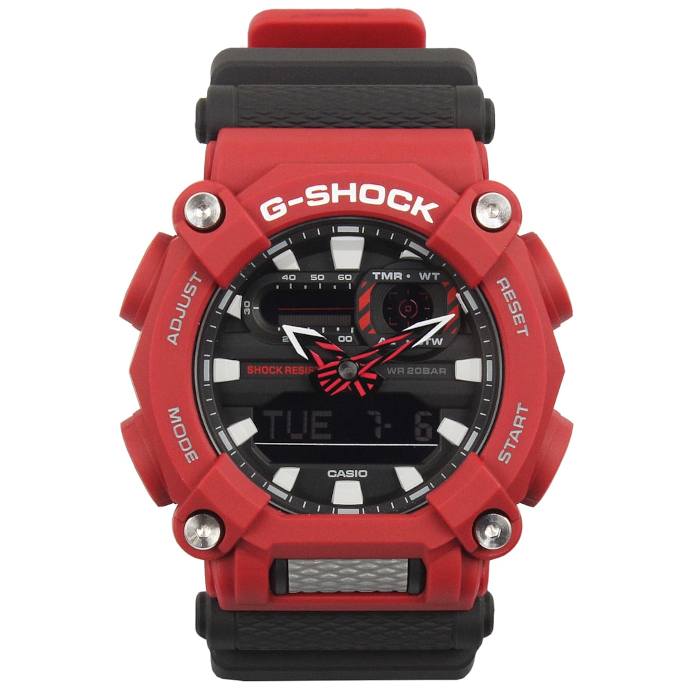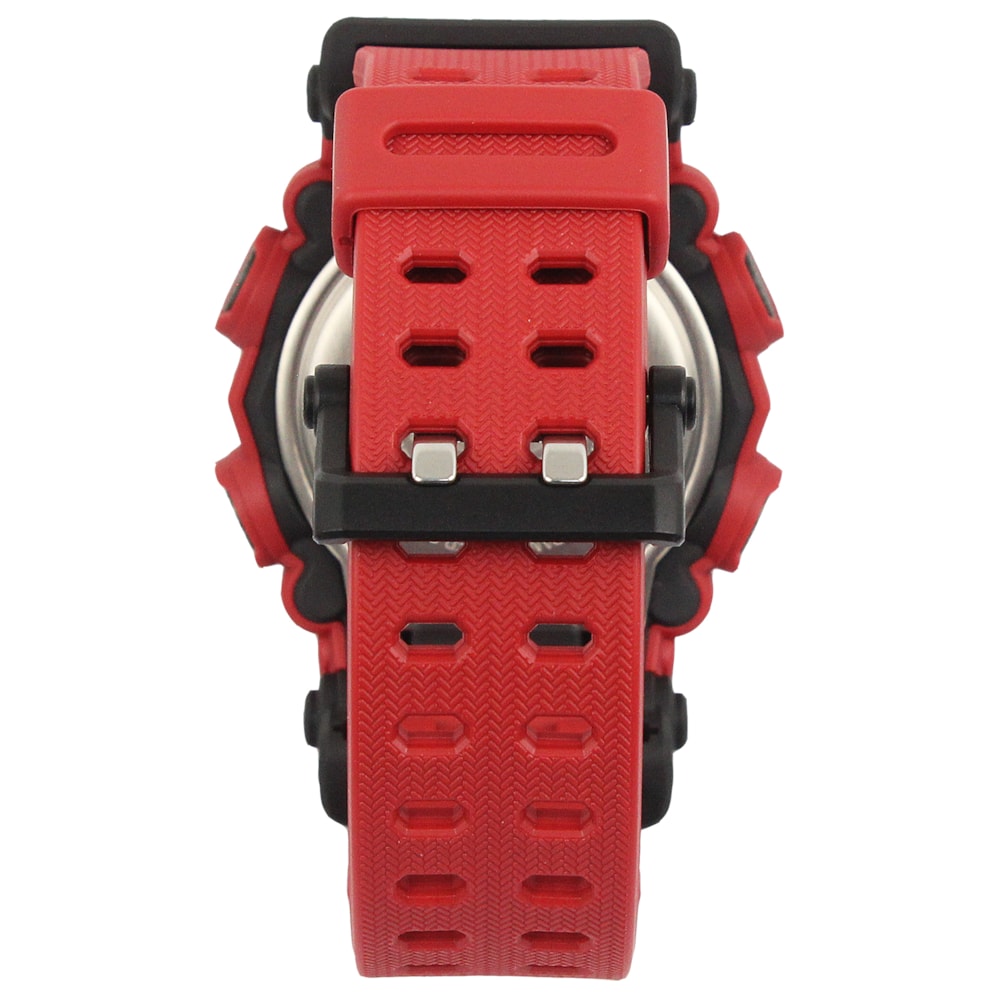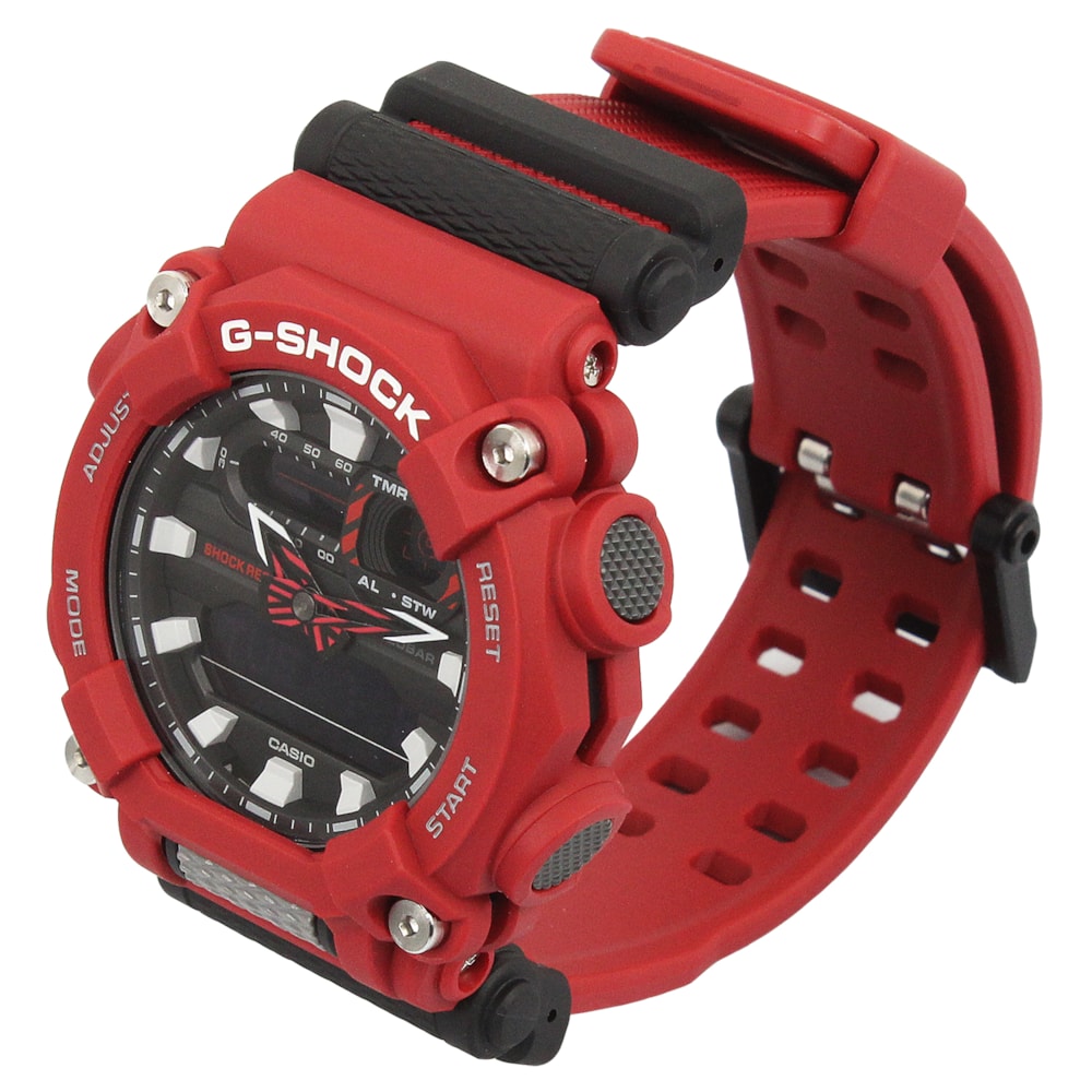 O Relógio G-Shock GA-900-4ADR apresenta um visual de design industrial criado por uma moldura de 10 lados que se assemelha ao formato de uma porca. A tampa frontal é presa por quatro parafusos para um visual robusto e resistente. A indicação das horas combinada é fornecida pelos ponteiros analógicos, juntamente com um monitor digital para proporcionar o máximo em facilidade operacional. O design dos ponteiros e as figuras gráficas que aparecem nas leituras digitais criam um design de face marcante que melhora a legibilidade.