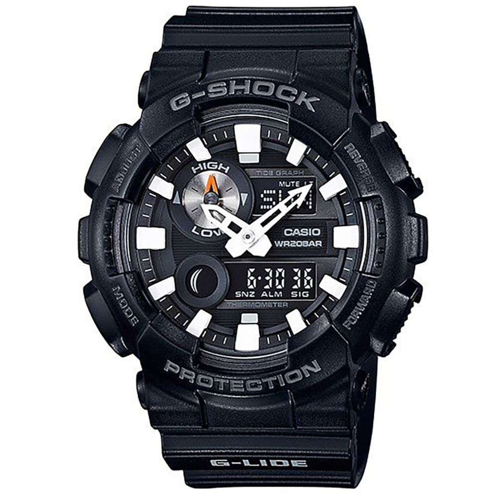 O novo modelo GAX-100 oferece o melhor dos formatos analógico e digital. Marcadores de horas grandes, ponteiro das horas e ponteiro dos minutos contribuem para facilitar a leitura. O ponteiro dos minutos em forma de seta e a cor contrastante das mãos analógicas fornecem leituras rápidas, mesmo enquanto se aguarda a próxima onda. Funções específicas para o Surf incluem gráfico de maré e lua