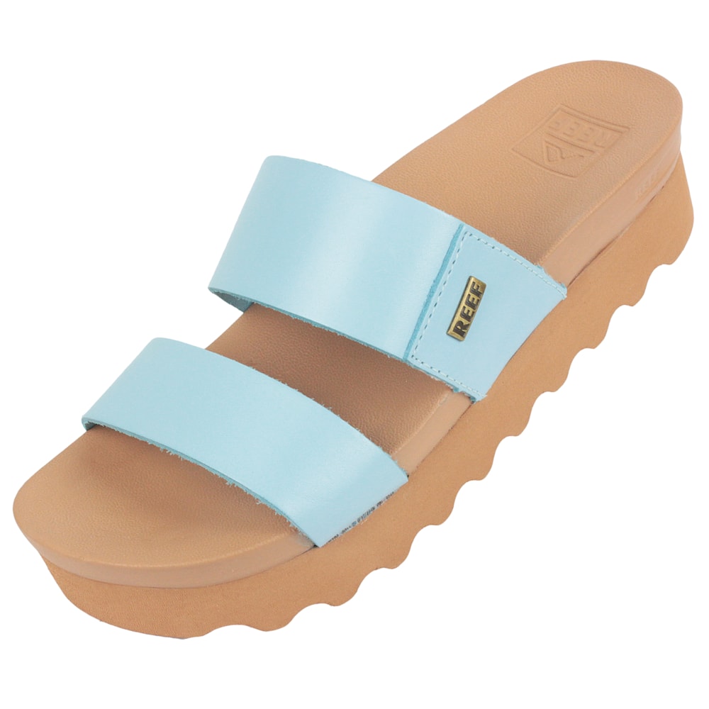 A Sandália Reef Cushion Vista Hi Baby Blue tem as tiras produzidas em couro. Construido sobre uma plataforma de EVA injetado de aproximadamente 3cm, logo Reef em patch metálico na tira. Palmilha extramacia conforto.