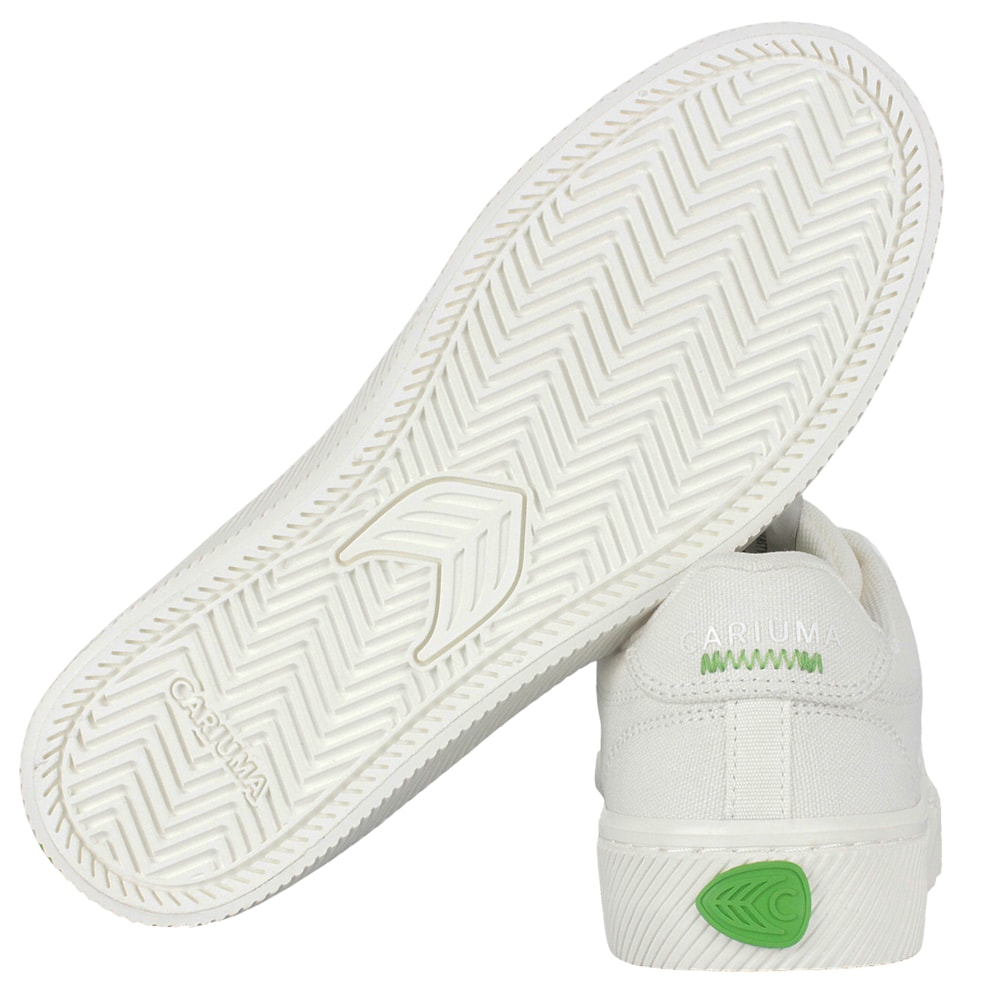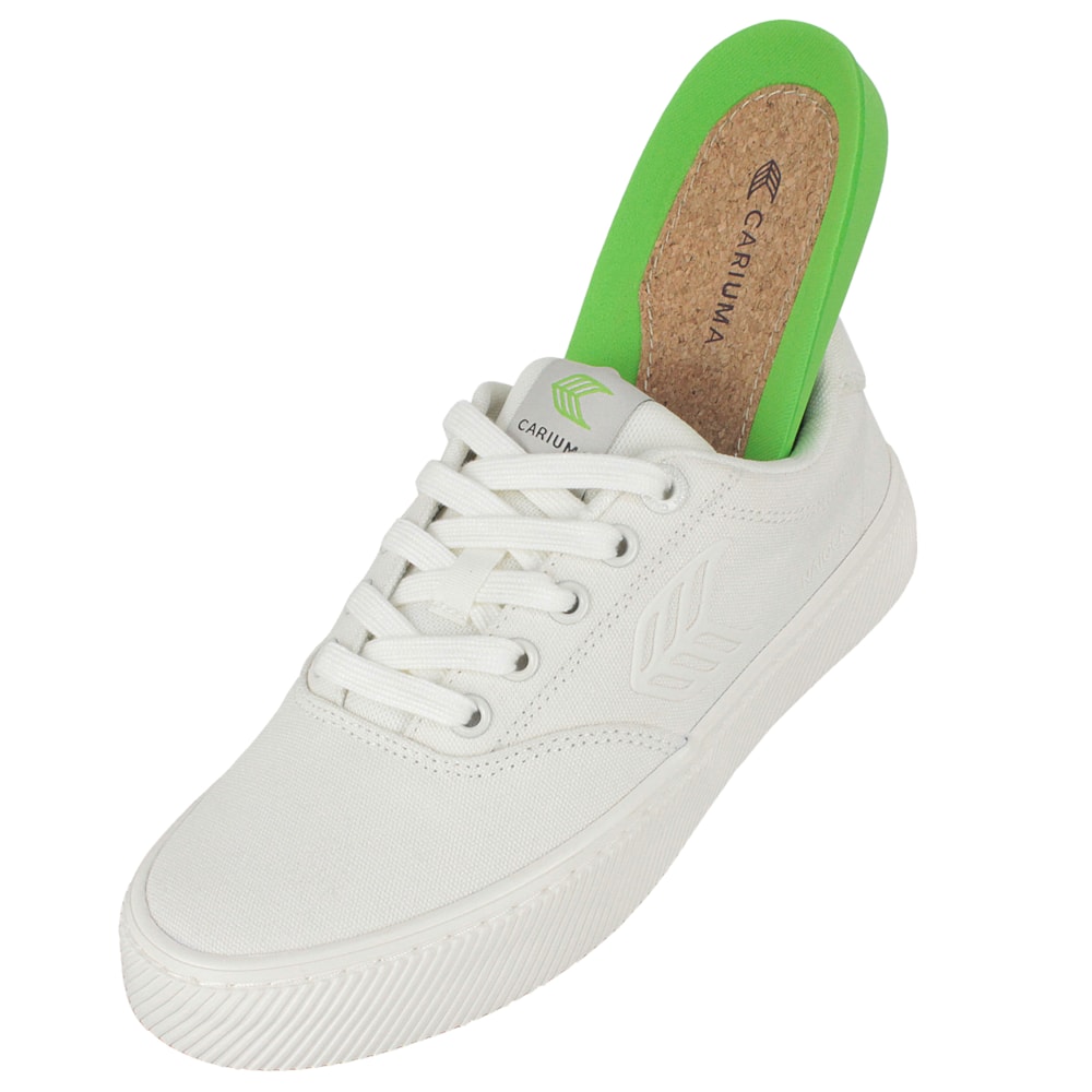 O Tênis Cariuma Naioca Canvas Off White Feminino é 100% vegano, produzido com lona orgânica resistente e borracha natural de origem ética. Inspirados na sensação de andar descalço na grama, projetamos as palmilhas sob medida para proporcionar conforto e suporte durante todo o dia. Cabedal produzido em lona de algodão orgânico, forro em malha reciclada e solado em borracha antiderrapante. A palmilha é produzida em uma combinação de cortiça e espuma de base biológica (de óleo de mamona), cadarços feitos com rPET + algodão orgânico e agulhas de metal gravadas