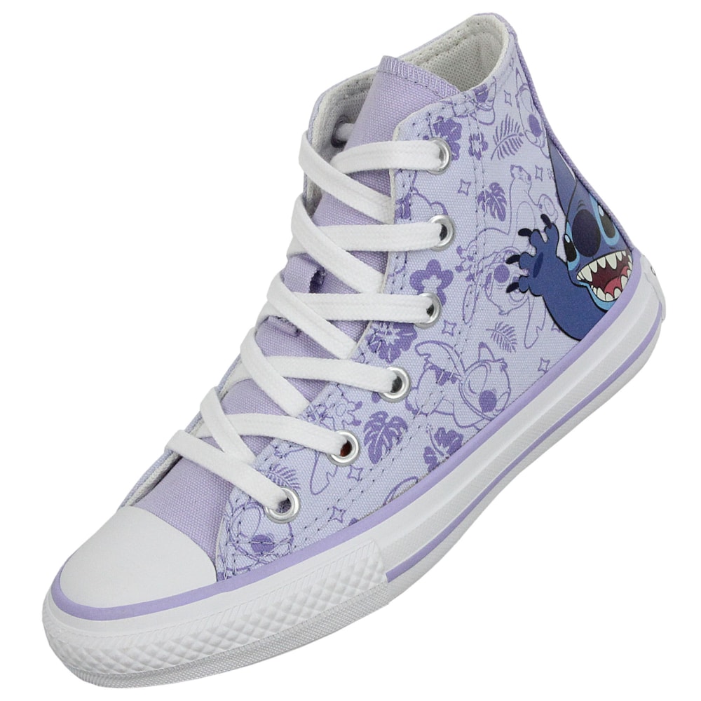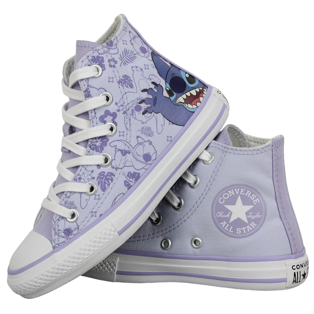 Tênis Converse Chuck Taylor All Star Hi Infantil Disney Stitch Azul Gelo Lilás Violeta Branco