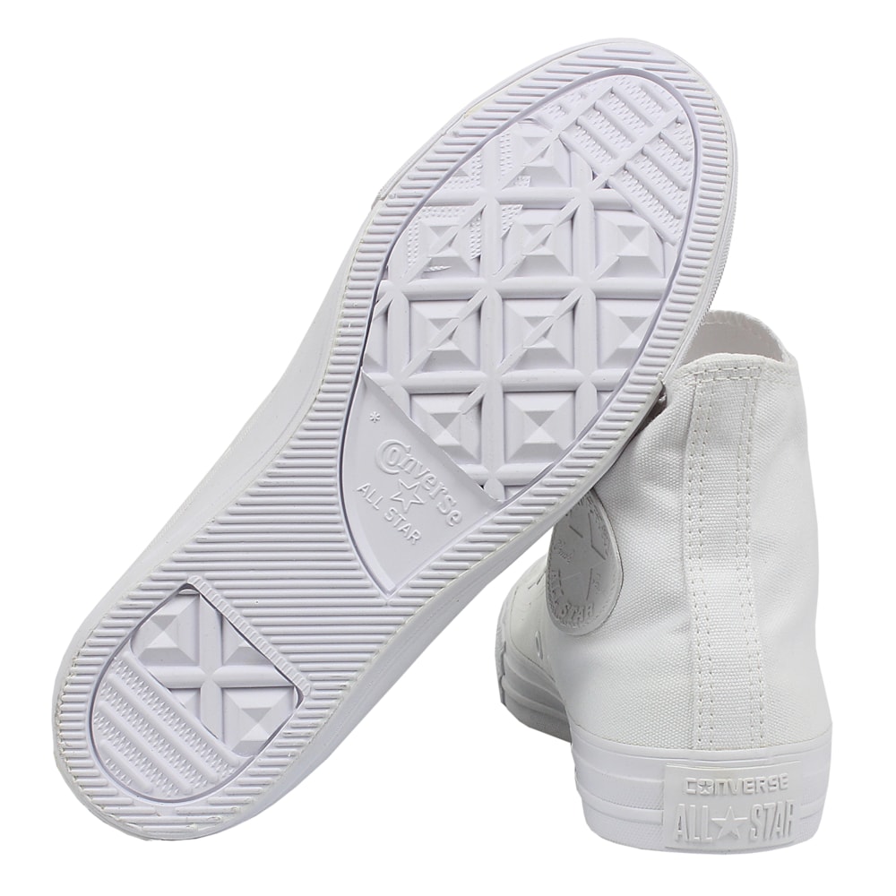 Produto monocromático (todo branco) de cano alto, confeccionado em tecido de lona acolchoada.. Produto tradicional da marca. Possui a forma baseada nos primeiros modelos Converse All Star. Acompanha o cadarço na cor da borracha e contém o friso da borracha preto. Possui o logo Converse All Star aplicada na parte interna do cano. Para a transpiração adequada dos pés, o produto conta com dois ilhóses na parte interna de cada um dos pés. Solado e vira de borracha vulcanizada.