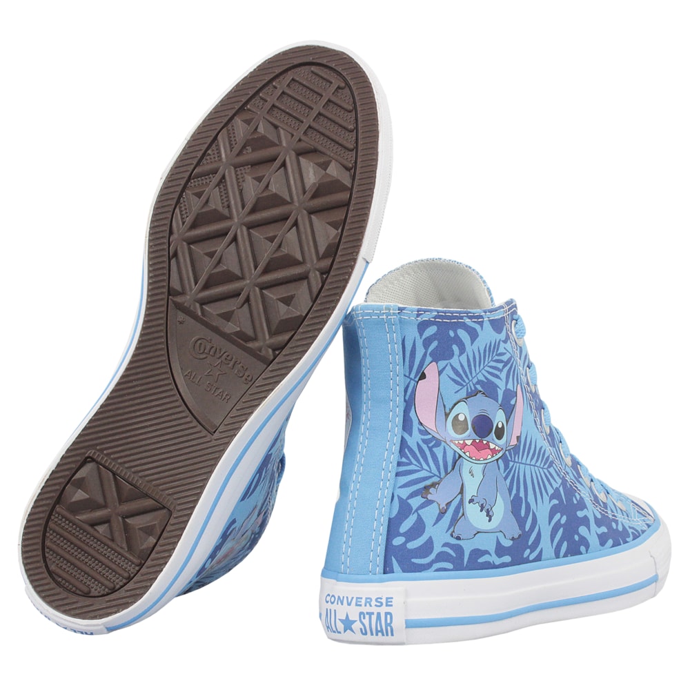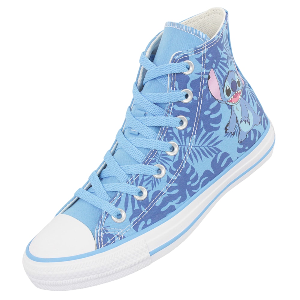 O Tênis Converse Chuck Taylor All Star Hi Stitch Azul Amendoa Branco é fruto de uma colaboração que traz a magia da Disney para o seu estilo. Este tênis de cano alto possui um cabedal em lona resistente, decorado com estampas exclusivas do adorável Stitch, capturando sua personalidade divertida e cativante.