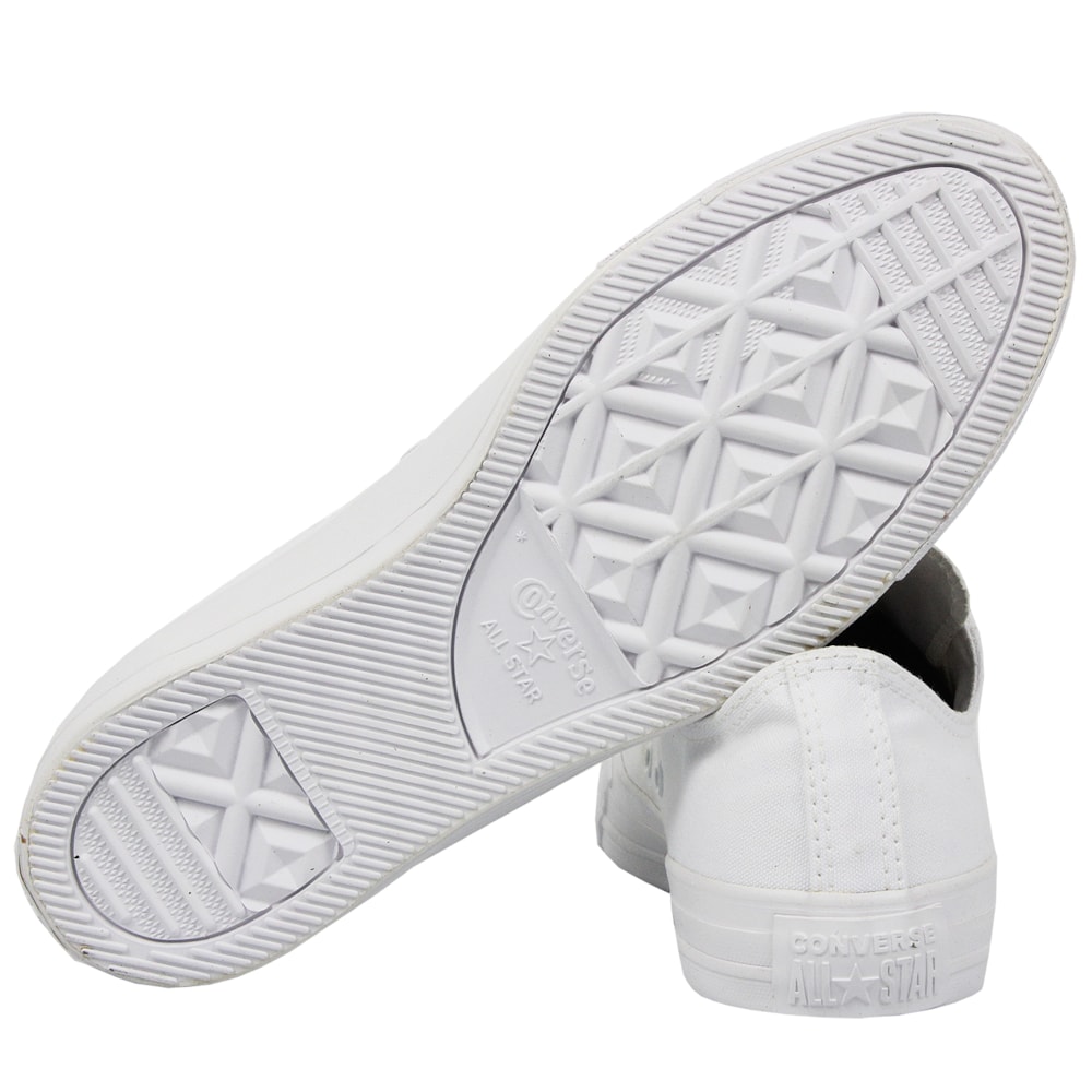 Produto monocromático (todo branco) de cano baixo, confeccionado em tecido de lona acolchoada.. Produto tradicional da marca. Possui a forma baseada nos primeiros modelos Converse All Star. Acompanha o cadarço na cor da borracha e contém o friso da borracha preto. Possui o logo Converse All Star aplicado na língua e no calcanhar. Para a transpiração adequada dos pés, o produto conta com dois ilhóses na parte interna de cada um dos pés. Solado e vira de borracha vulcanizada.