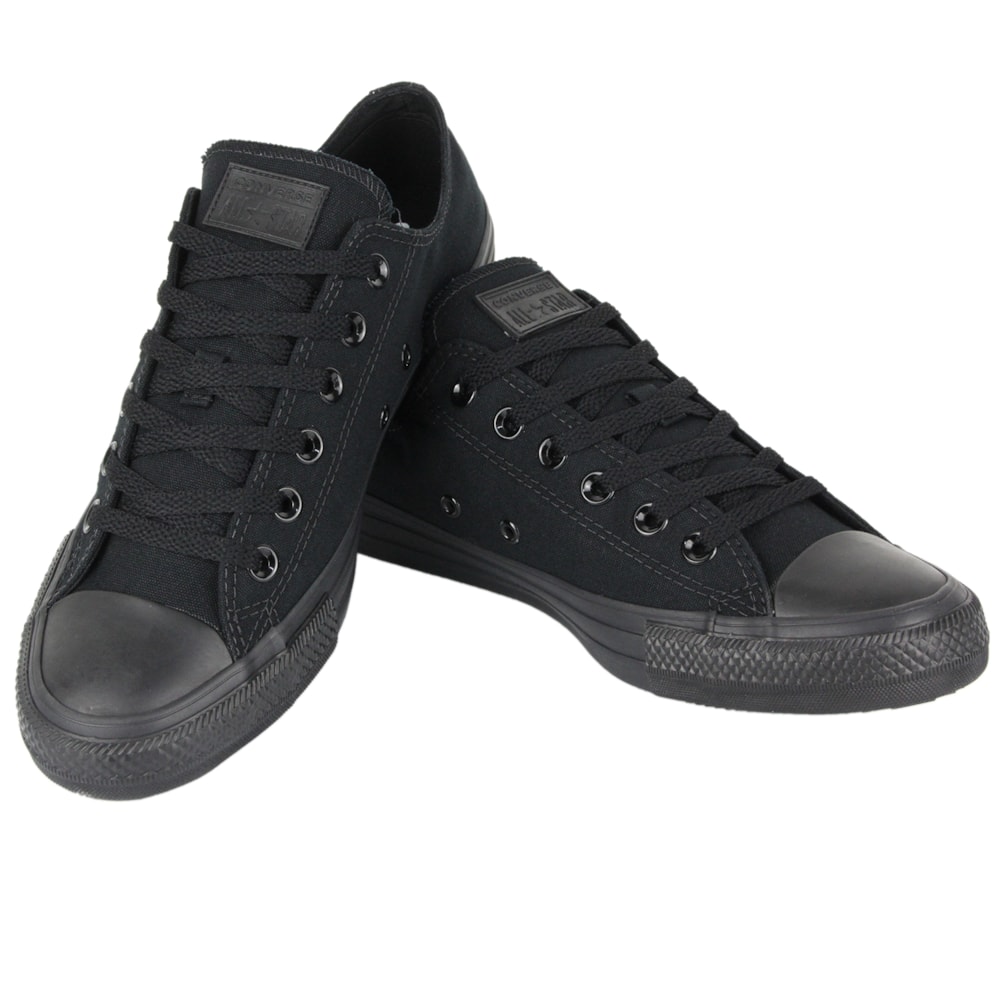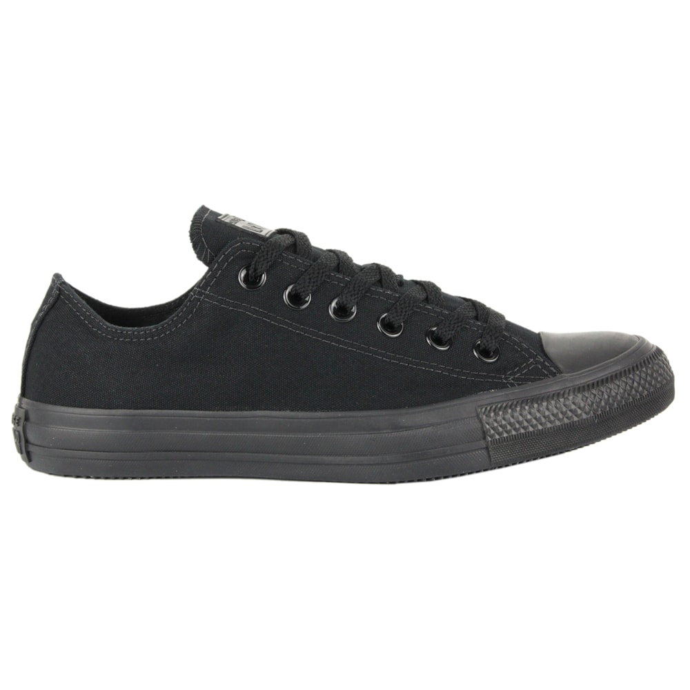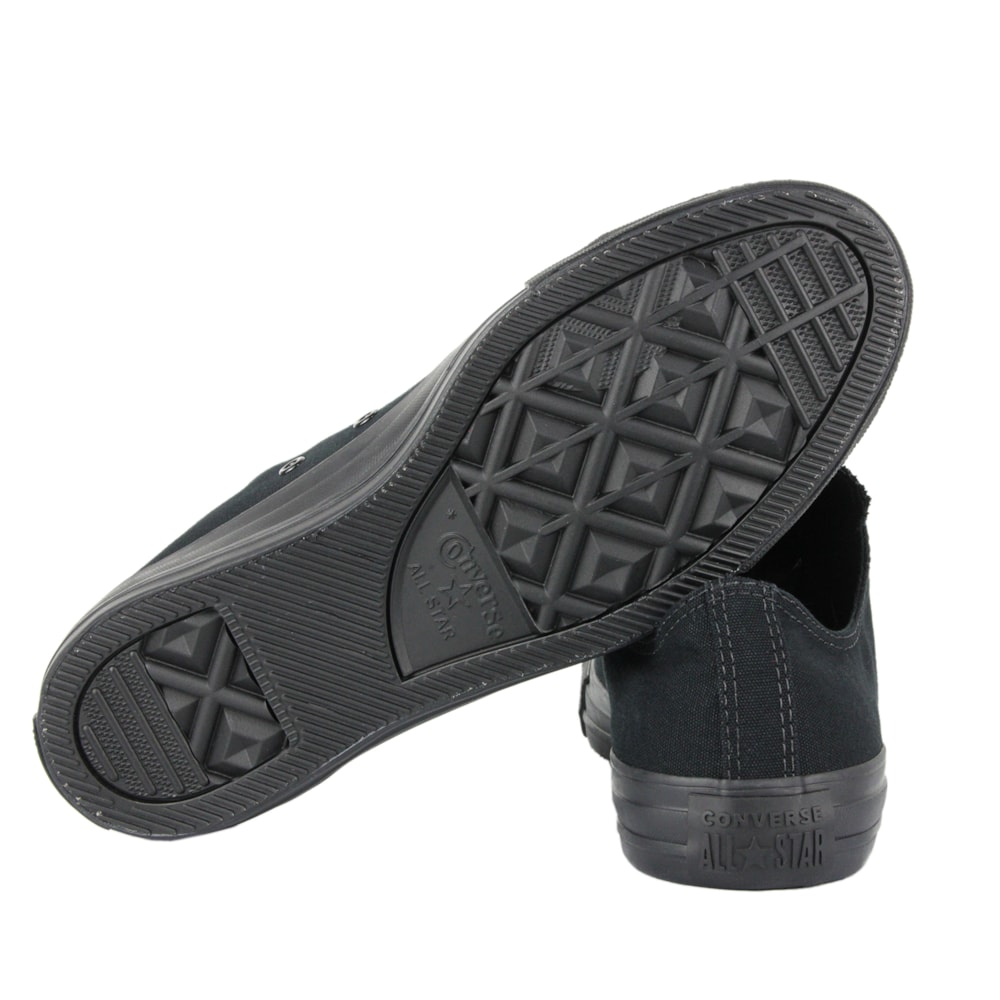 Produto monocromático (todo preto) de cano baixo, confeccionado em tecido de lona acolchoada.. Produto tradicional da marca. Possui a forma baseada nos primeiros modelos Converse All Star. Acompanha o cadarço na cor da borracha e contém o friso da borracha preto. Possui o logo Converse All Star aplicado na língua e no calcanhar. Para a transpiração adequada dos pés, o produto conta com dois ilhóses na parte interna de cada um dos pés. Solado e vira de borracha vulcanizada.