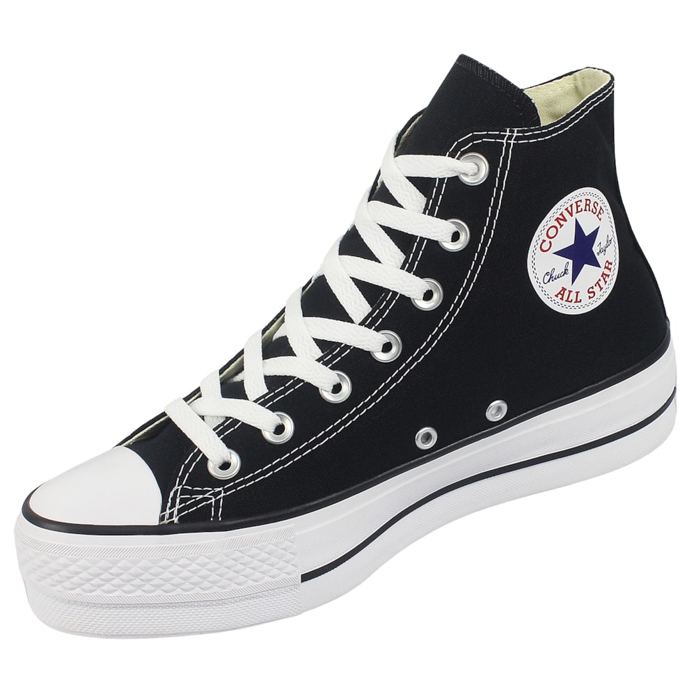 Tênis Converse de cano alto, construido em cima de um solado alto tipo plataforma de aproximadamente 3cm de altura. Confeccionado em tecido de algodão tipo lona. Possui o logo Chuck Taylor All Star aplicado na parte interna do cano. Produto construido sobre a forma tradicional da marca com salto alto. Para a transpiração adequada dos pés, o produto conta com dois ilhóses na parte interna de cada um dos pés. Solado e vira de borracha.