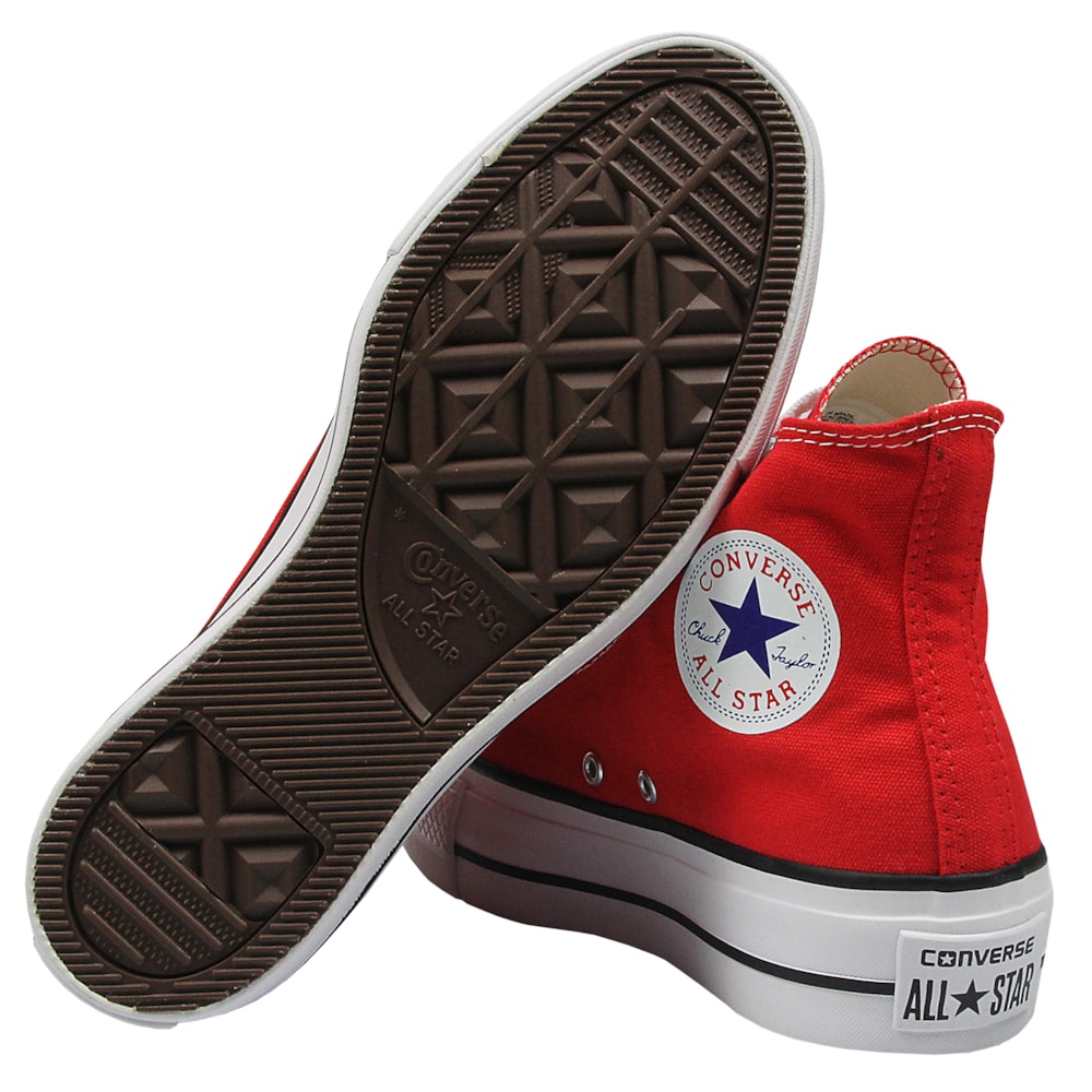 Tênis Converse de cano alto, construido em cima de um solado alto tipo plataforma de aproximadamente 2cm de altura. Confeccionado em tecido de algodão tipo lona. Possui o logo Chuck Taylor All Star aplicado na parte interna do cano. Produto construido sobre a forma tradicional da marca com salto alto. Para a transpiração adequada dos pés, o produto conta com dois ilhóses na parte interna de cada um dos pés. Solado e vira de borracha.
