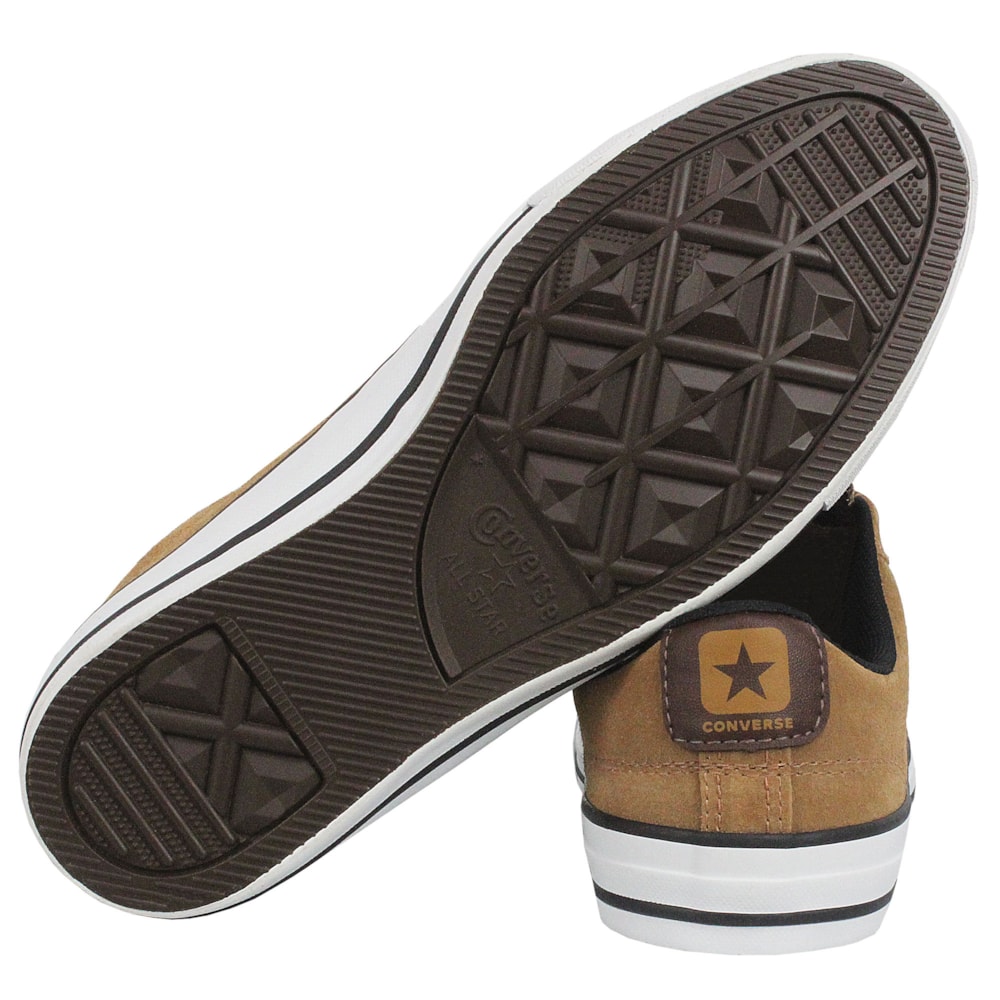 O Tênis Converse Star Player Caramelo Médio Marrom Branco mescla a silhueta tradicional da linha Chuck Taylor com o colarinho acolchoado e o logo Converse Star Chevron bordado na lateral. Confeccionado em camurça com o solado e vira de borracha.